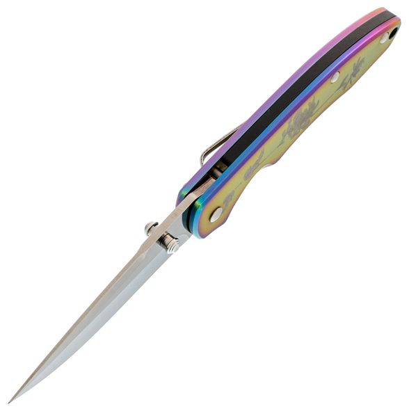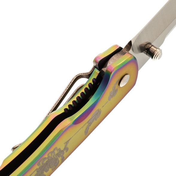 Sanrenmu 7073LUX-SK - не просто складной нож, а сбалансированный инструмент, который одинаково уместен как на деловой встрече, так и в рюкзаке туриста. Благодаря продуманному дизайну и акцентам в отделке он сразу привлекает внимание: градиентная окраска и гравировка с флористическими мотивами делают каждый экземпляр чуть-чуть уникальным.