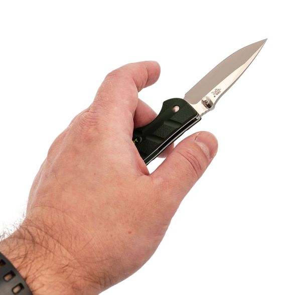 Эргономичная рукоятка изготовлена из прочного ABS-пластика. Этот материал обеспечивает надёжный хват, устойчив к износу и легко очищается. Нож удобно ложится в руку, не скользит даже при влажных условиях и хорошо контролируется в работе.