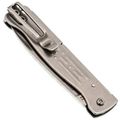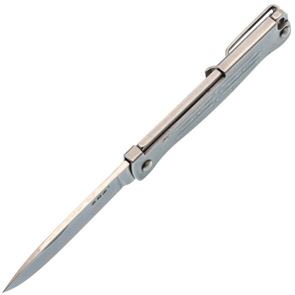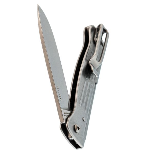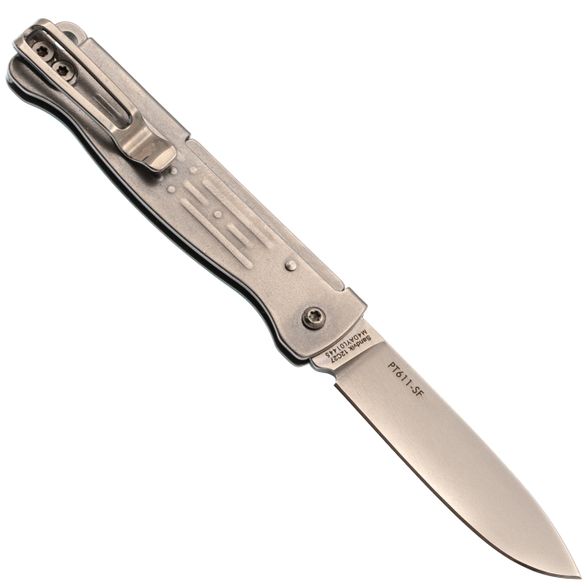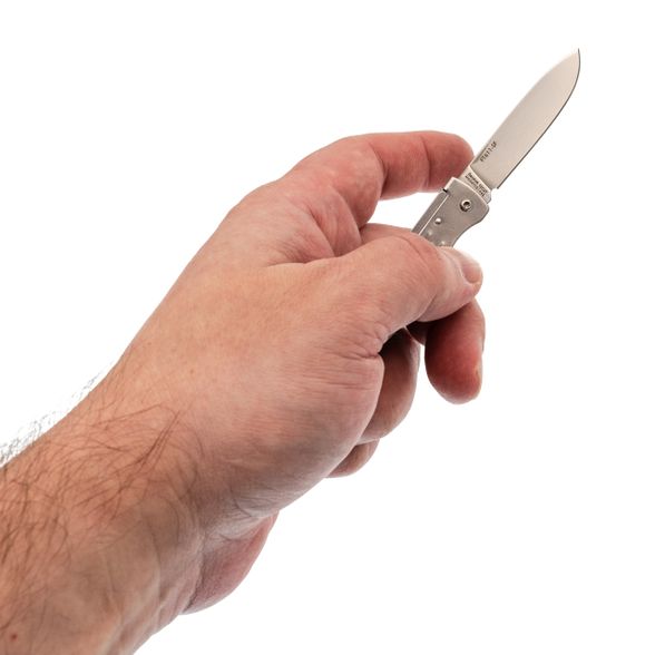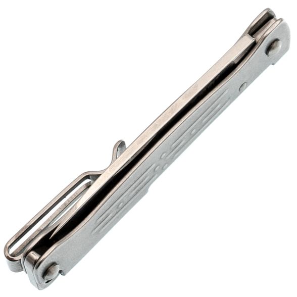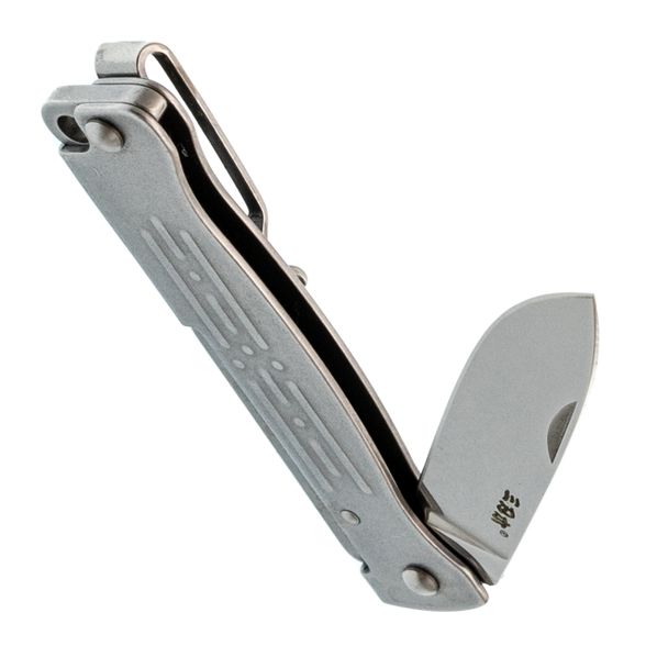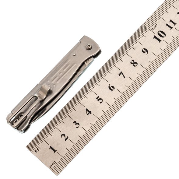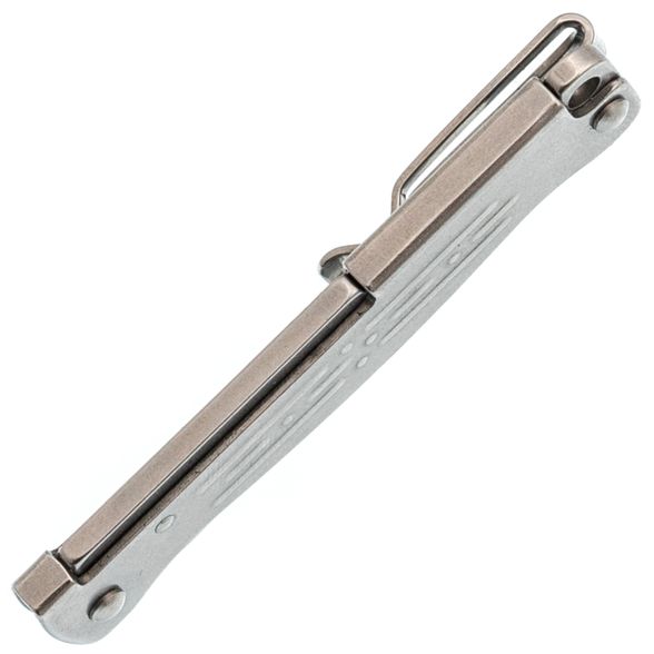 Рукоять сделана из гнутого листа нержавейки. Это решение дает сразу два плюса: она получается очень плоской, не создавая лишнего объема в кармане, и при этом максимально прочной для своего веса. Замок здесь классический Slip-Joint. В нем нет жесткой фиксации лезвия, как на подпружиненных замках. Вместо этого мощная пружина удерживает клинок в открытом положении, но если приложить усилие, он сложится. Это безопасно для тех задач, на которые рассчитан нож, и исключает случайное складывание при резке. Для ношения предусмотрена карманная клипса - можно зацепить нож за край кармана, и он не потеряется среди ключей и мелочи.
