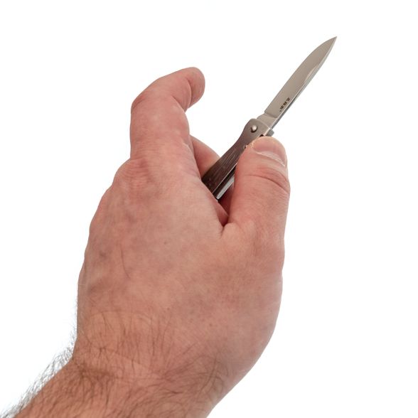 Форма клинка здесь самая что ни на есть рабочая - Drop Point. Это значит, что острие находится на одной линии с обухом, что дает отличный контроль при резке. Спуски идут прямо от обуха, благодаря чему нож отлично режет, а не мнет материал. Длина клинка всего 50 мм - этого достаточно для самых мелких и частых операций: открыть конверт, срезать бирку, заточить карандаш. Открывается нож за ногтевой зацеп, никаких лишних механизмов - вставил ноготь в паз и вывел клинок из рукояти.