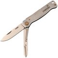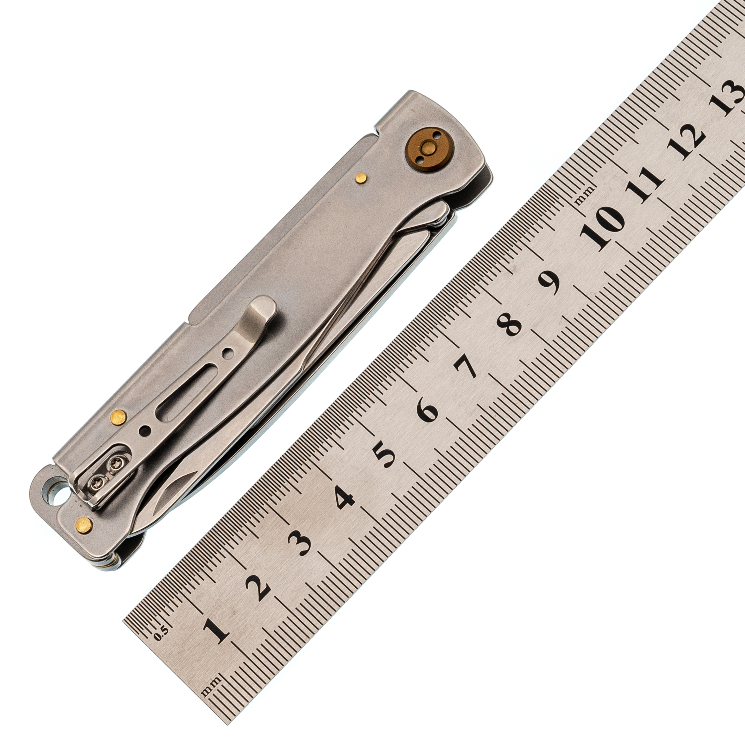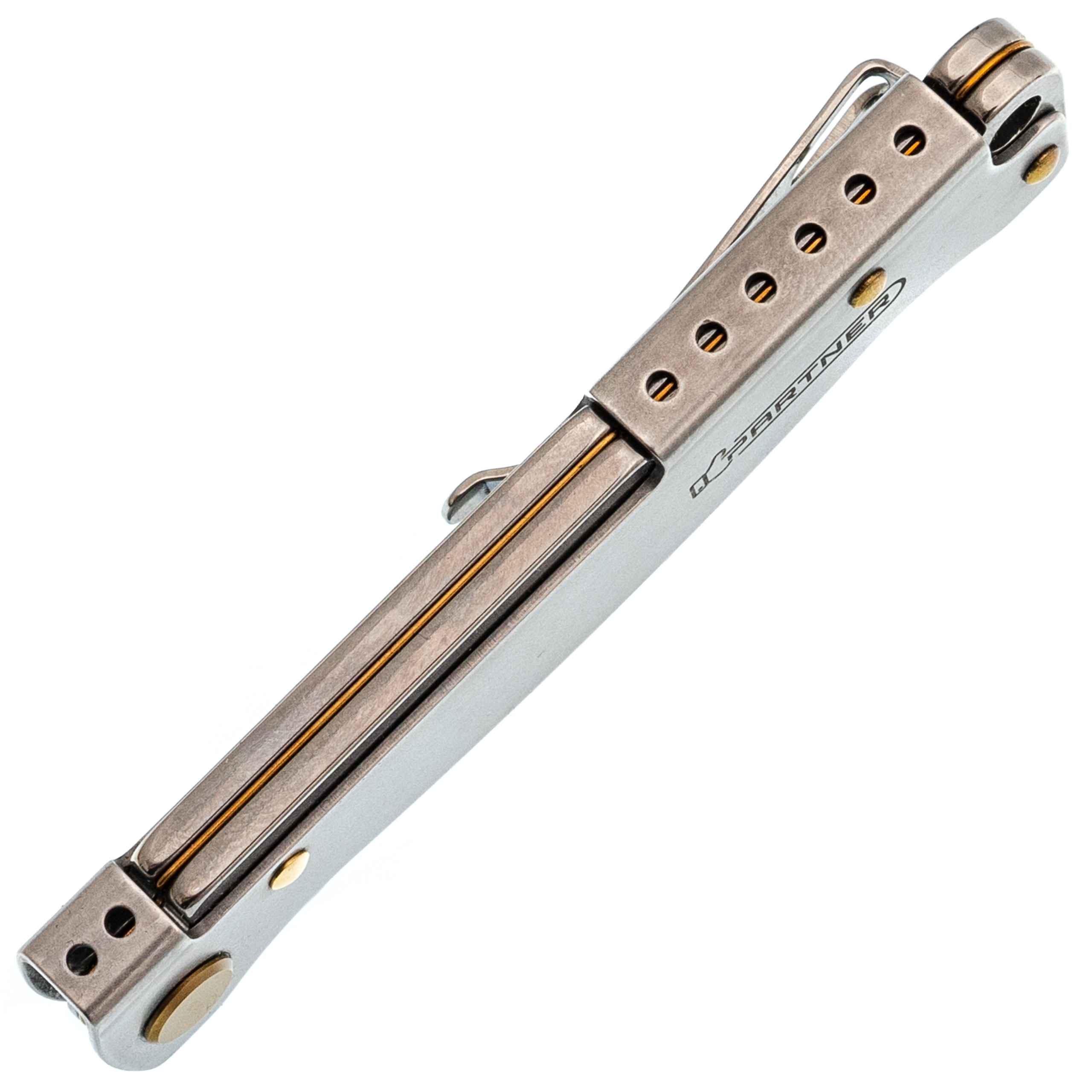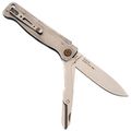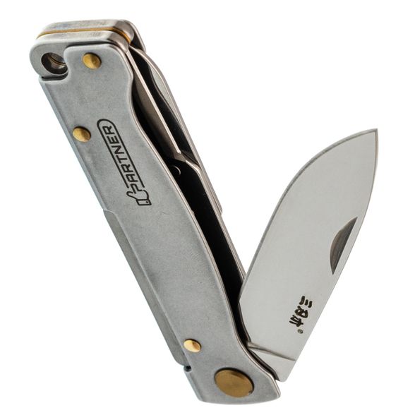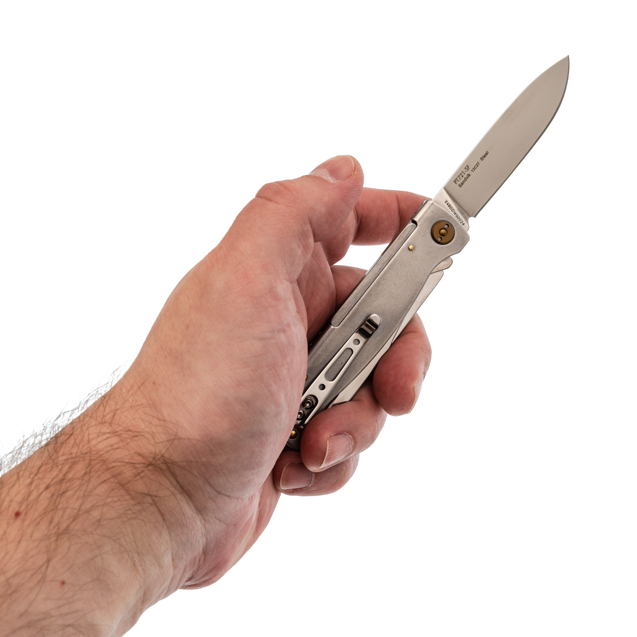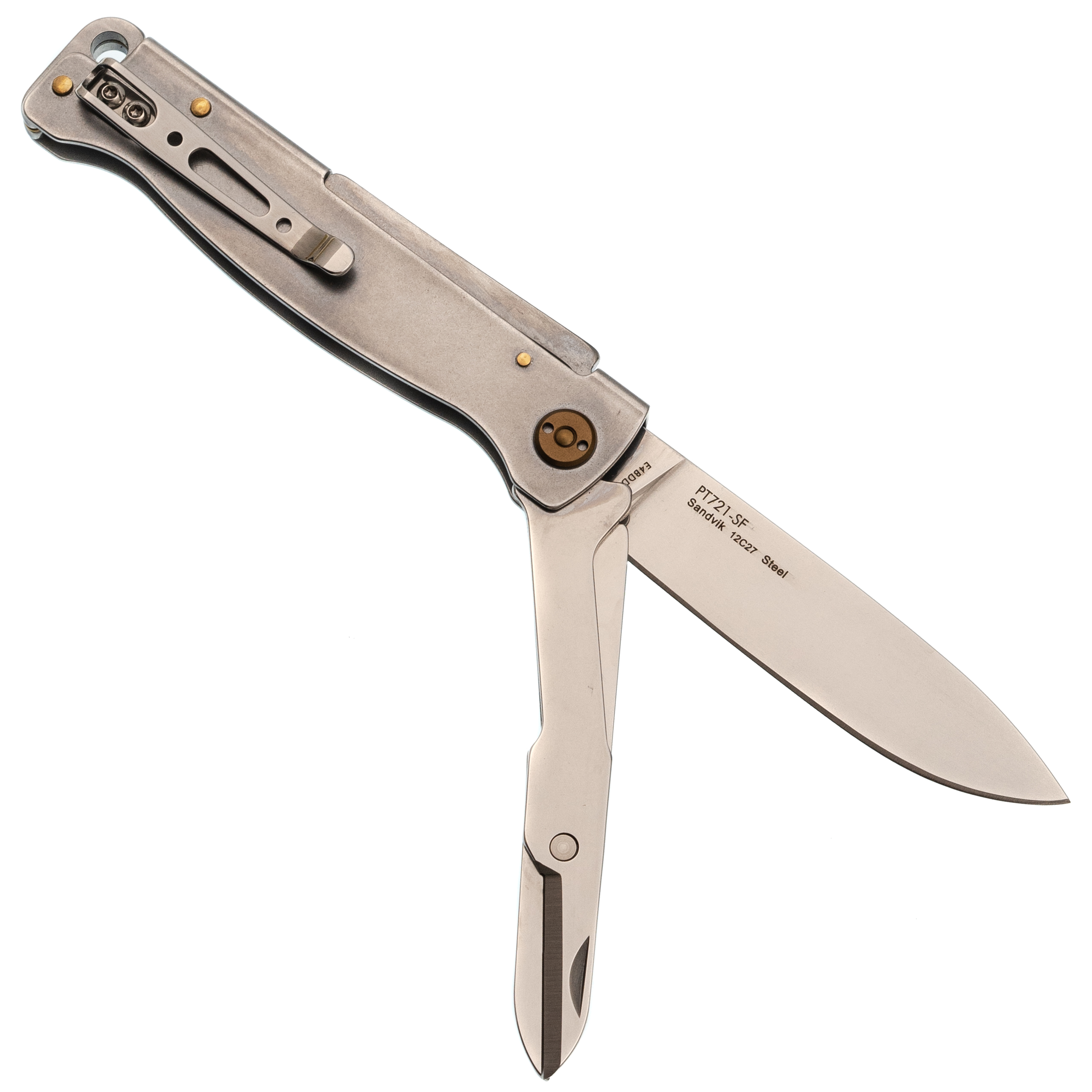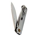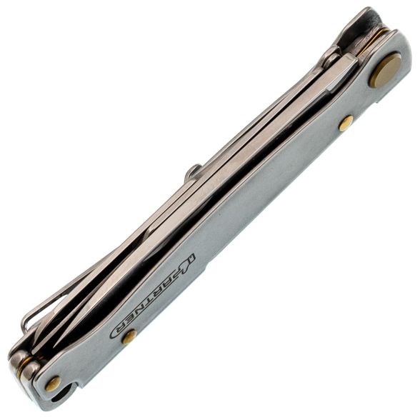 Рукоять выполнена из гнутого листа нержавеющей стали - простое и гениальное решение, которое дает максимальную прочность при минимальной толщине. Нож практически не чувствуется в кармане. Замок здесь классический Slip-Joint: мощная пружина надежно удерживает клинок в открытом положении, но при этом конструкция остается максимально простой и надежной. Для ношения предусмотрена карманная клипса - нож всегда зафиксирован и не болтается среди ключей или мелочи в кармане.