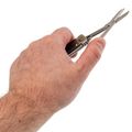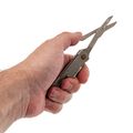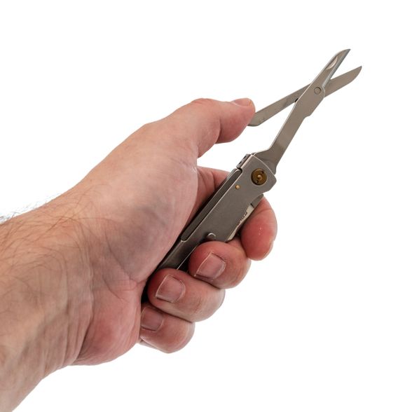 Главная особенность этой модели - удачное сочетание клинка и ножниц. Клинок с профилем Drop Point имеет прямые спуски от обуха, что обеспечивает отличный рез практически любым хватом. Это универсальная форма: можно и коробку вскрыть, и веревку перерезать, и веточку подровнять. Но настоящая находка - это ножницы. Они здесь не для галочки, а полноценно рабочие: с хорошим ходом и острыми кромками. Удобно, когда в одном инструменте есть и клинок, и аккуратные ножницы для бумаги, ниток или этикеток.