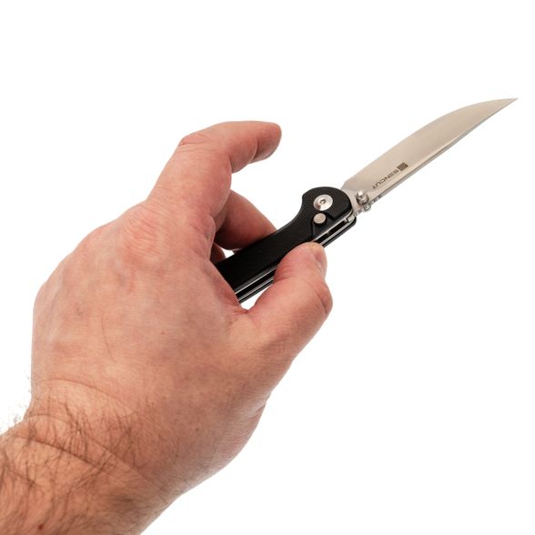 Рукоять ножа выполнена из прочного и надежного материала G10 черного цвета, который приятно ощущается в руке и гарантирует отличный хват. Удобный профиль и легкость конструкции делают этот нож комфортным даже при длительном использовании. К тому же, рукоять имеет современный дизайн, который подчеркивает эстетическую сторону ножа, сочетая стиль и функциональность.