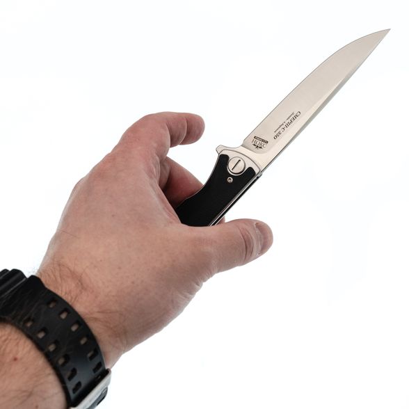 Эргономичная рукоять G10. Произведена из черного комбинированного материала – стеклоткани с пропиткой в эпоксидной смоле под прессом. Легко шлифуется до глянцевого блеска с формированием эргономики. В продаже есть другой нож Смерш С 350 с красной рукоятью из карбона. Дополнительно к клинку Арт. 350-189401 заказывайте ножны.