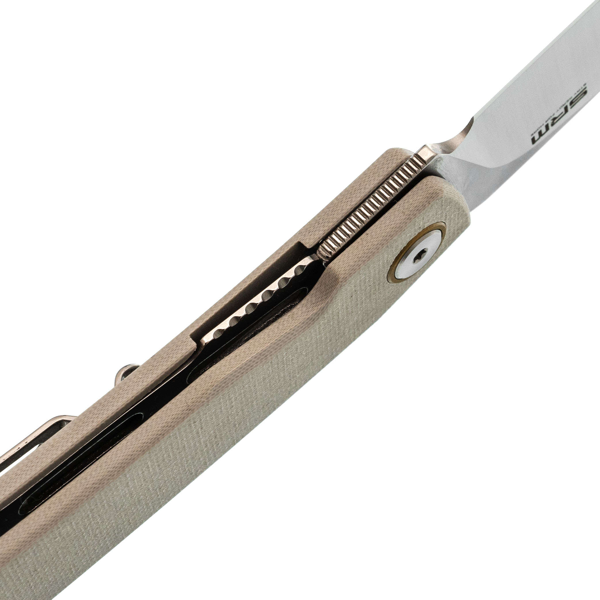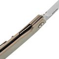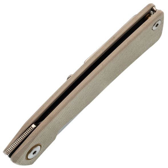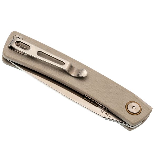 Рукоять белого цвета не только придает ножу стильный внешний вид, но и обеспечивает комфорт при использовании. Легкая и изогнутая форма отлично ложится в руку, а материал G10 не скользит, что увеличивает контроль при работе с ножом. Серый цвет добавляет ножу изысканности, делая его более привлекательным и необычным.