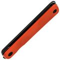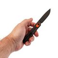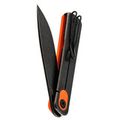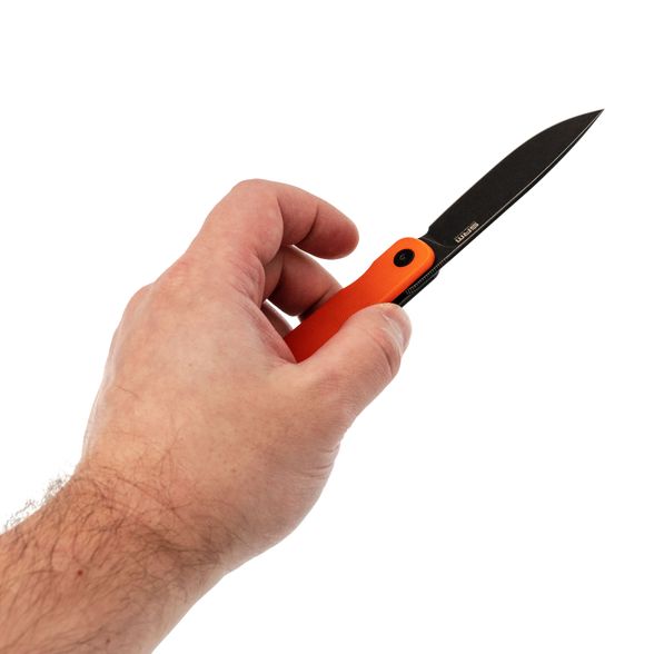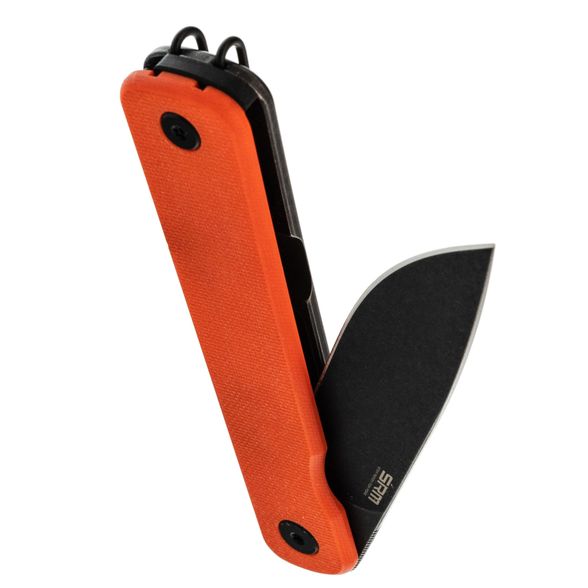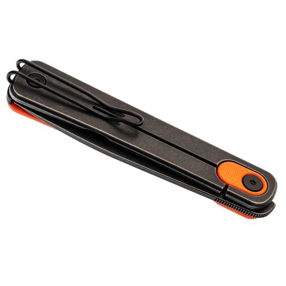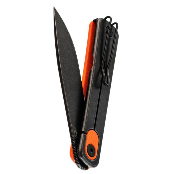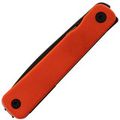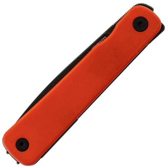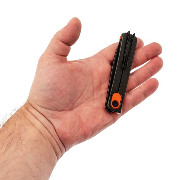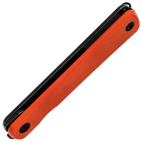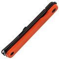 Рукоять выполнена из G10 с ярким оранжевым покрытием, что делает модель визуально выделяющейся и легко узнаваемой. Эргономичная форма адаптирована под разные типы хвата, обеспечивая комфорт даже при длительном использовании. Текстура материала предотвращает скольжение, а легкость конструкции способствует удобству при постоянном ношении. Модель сочетает в себе надежность, стиль и продуманную геометрию, делая ее актуальной для тех, кто ищет сбалансированный инструмент с характером.