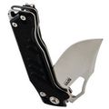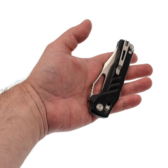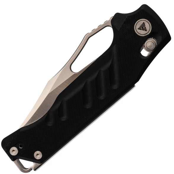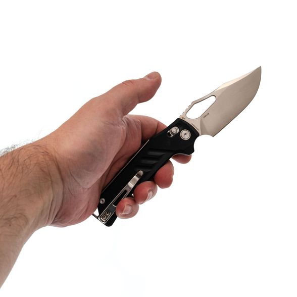 Клинок выполнен из стали D2, которая известна своей высокой твердостью и износостойкостью. Эта сталь обладает отличной коррозионной стойкостью и простотой в заточке, что делает нож практичным и легким в обслуживании. Прямые и высокие спуски при большой ширине создают отличную режущую способность, делая данную модель эффективным инструментом для реза. Большое отверстие в позволяет удобно открывать нож даже в перчатках.