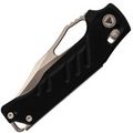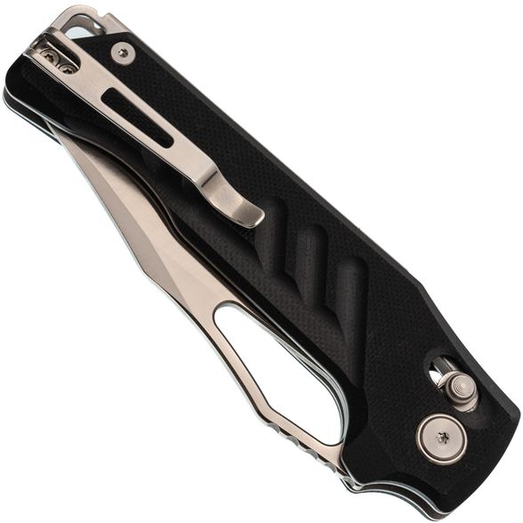 Рукоять имеет изогнутую форму с чойлом и подпальцевой выемкой, что обеспечивает комфортный и безопасный хват. Такая форма позволяет уверенно выполнять протыкающие резы и создаёт точный контроль над ножом при более аккуратных задачах. Основа рукояти изготовлена из единого стального лайнера, что создает ощущение надежности и прочности. Накладки выполнены из стеклотекстолита G10, который отличается высокой прочностью, устойчивостью к воздействию химических веществ и температурным перепадам. Ручка расположена несколько выше лезвия, что удобно при резке на поверхности.