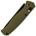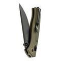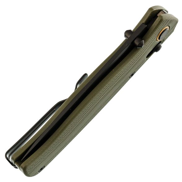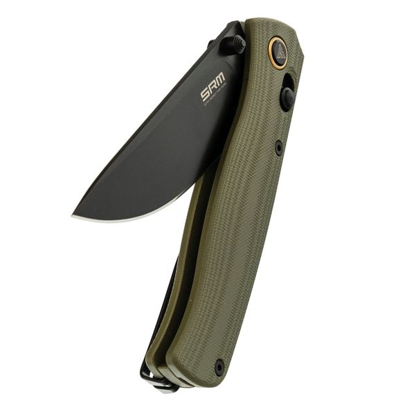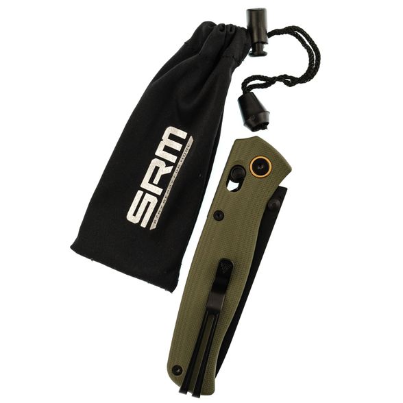 Для защиты от коррозии и в качестве оригинального дизайна клинок обработан специальным составом, придающим характерный черный цвет. Длина лезвия составляет 82 мм, а толщина обуха все 3 мм, устойчив к ударным нагрузкам, без чего невозможен любой поход. По нему можно бить другим твердым предметом, не боясь за целостность конструкции. Производитель SRM Knives для ручки применил стилизованный под дерево зеленый материал, который оригинально смотрится и легко отмывается от загрязнений. Широкий клинок в форме пера делает его многофункциональным аксессуаром. Его можно взять с собой в дорогу как помощника на все случаи жизни.