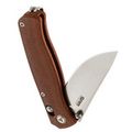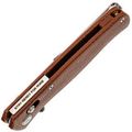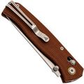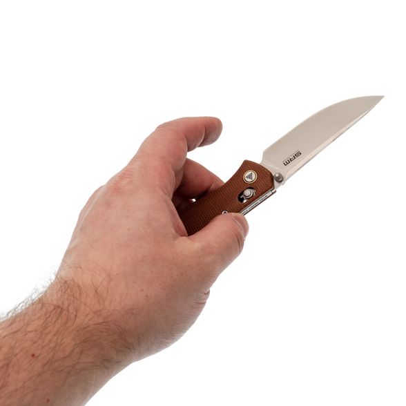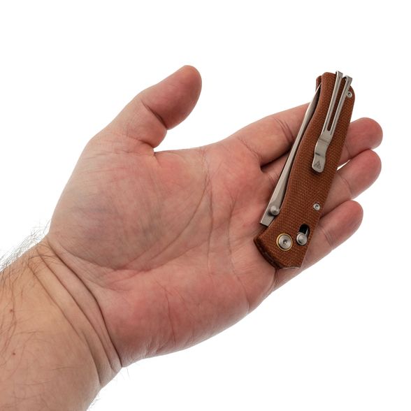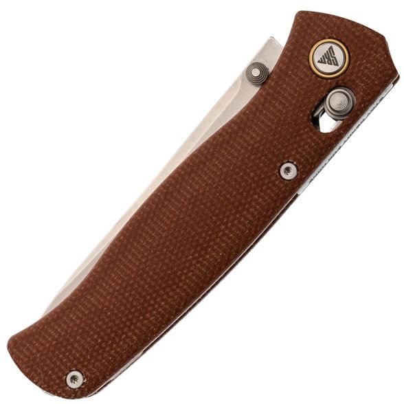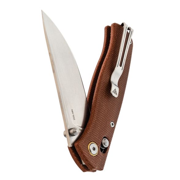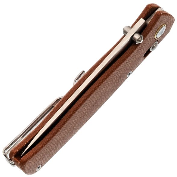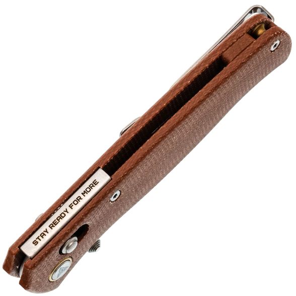 Рукоять SRM Medal 255L имеет инновационную конструкцию с одним согнутым лайнером — монолайнером, что придаёт ножу не только прочность, но и уникальную форму рукояти. Накладки выполнены из коричневой микарты, материала, который известен своей лёгкостью, прочностью и приятной текстурой. Микарта со временем приобретает уникальный внешний вид благодаря естественному износу. Дополнительно стоит отметить, что нож оснащён системой Ambi-Lock, которая удобна как для правшей, так и для левшей, а также позволяет инерционно открывать и закрывать нож. Клипса Ambi Clip — собственная разработка SRM — обеспечивает удобное крепление и лёгкость в перестановке без необходимости откручивать винты.