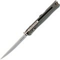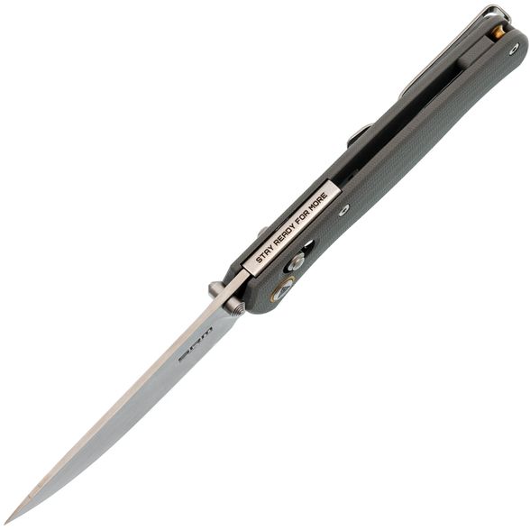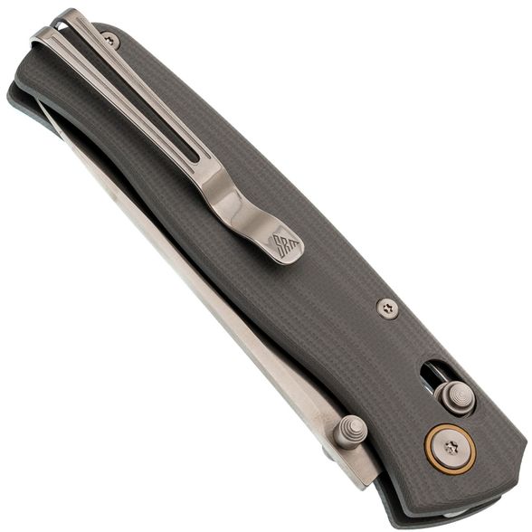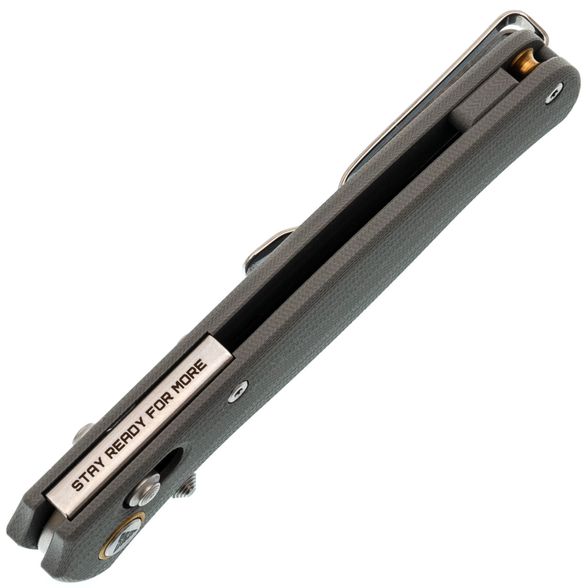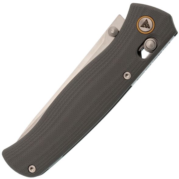 - Накладки рукояти из стеклотекстолита G10: материал отличается высокой стойкостью к механическим нагрузкам, влагостойкостью и минимальными требованиями в уходе; накладки окрашены в редкий для ножей серый цвет, что подчёркивает сдержанный и универсальный дизайн.