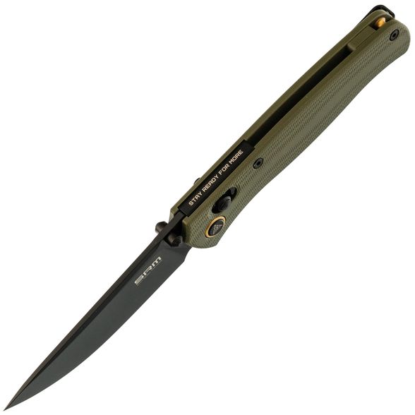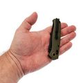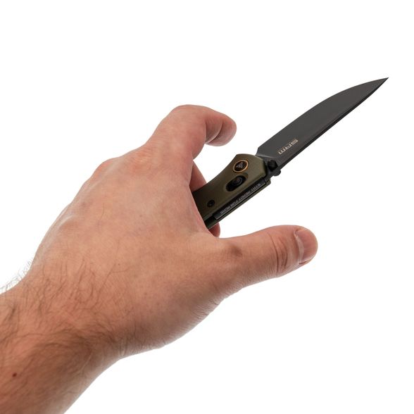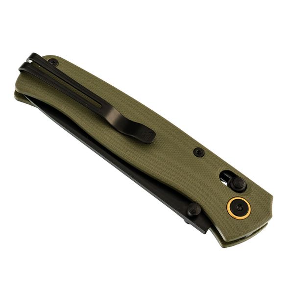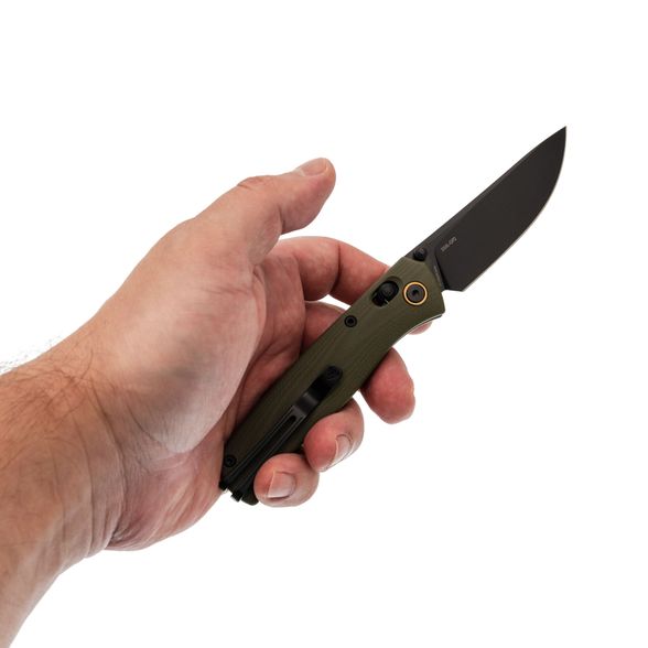 Накладки рукояти из стеклотекстолита G10 OD Green: прочный, лёгкий, влагостойкий материал; зелёный оттенок OD Green гармонирует с чёрным клинком, создавая последовательный милитари-акцент; минимальные требования к уходу делают эксплуатацию комфортной.