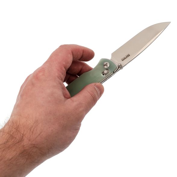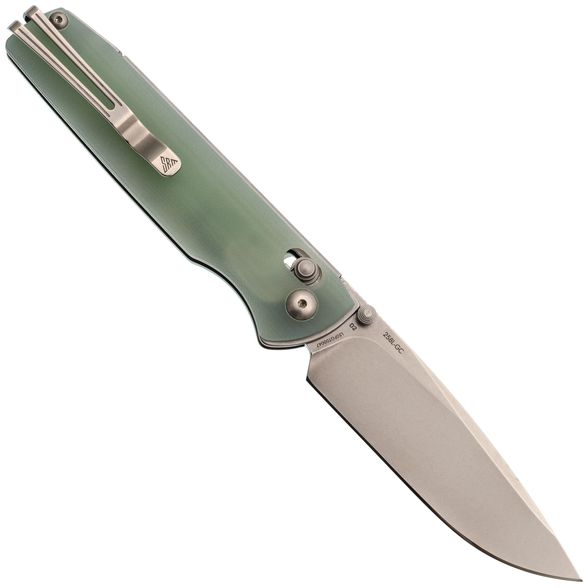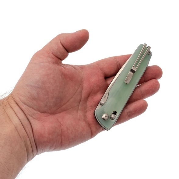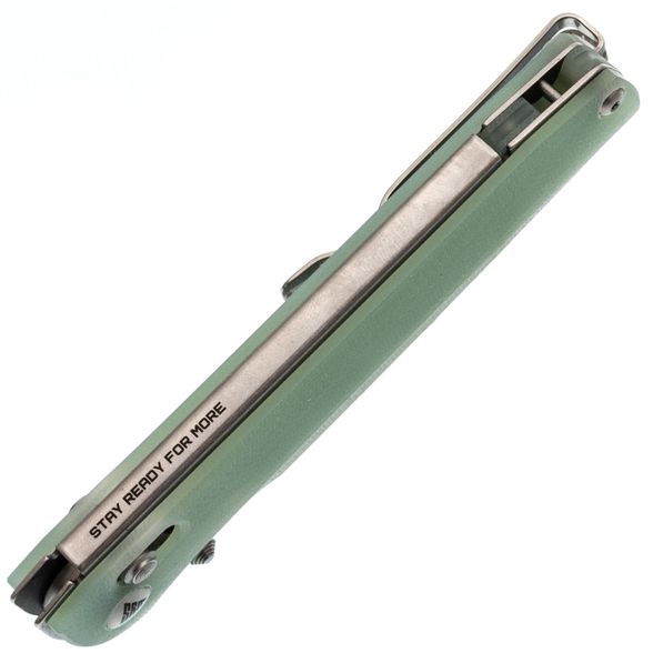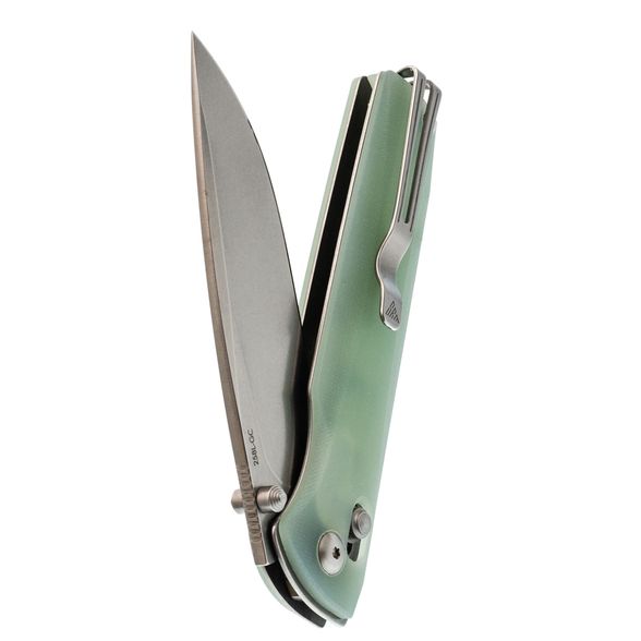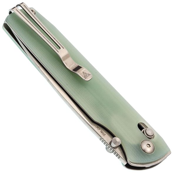 Рукоять ножа реализована с использованием фирменного решения: основой служит моно лайнер – цельный кусок стали, согнутый для формирования удобной рукояти, что повышает прочность и стабильность конструкции. На моно лайнер крепятся накладки, выполненные из стеклотекстолита G10 – материала, который отличается высокой прочностью, малым весом и неприхотливостью (не впитывает запахи и устойчив к воздействию воды), представлен в натуральном бело-зеленоватом цвете с возможностью последующей покраски. Механизм запирания Ambi-Lock обеспечивает надежное фиксирование и удобство эксплуатации обеими руками, а клипса Ambi-Clip с пружинной конструкцией не требует винтового крепления, что позволяет легко снимать и переставлять её при необходимости.