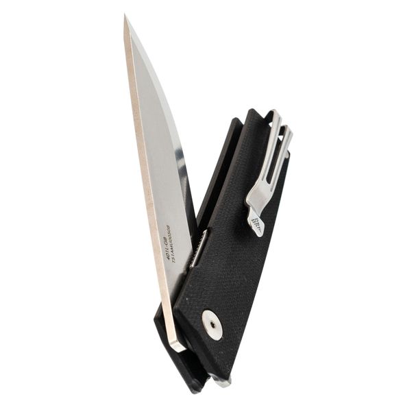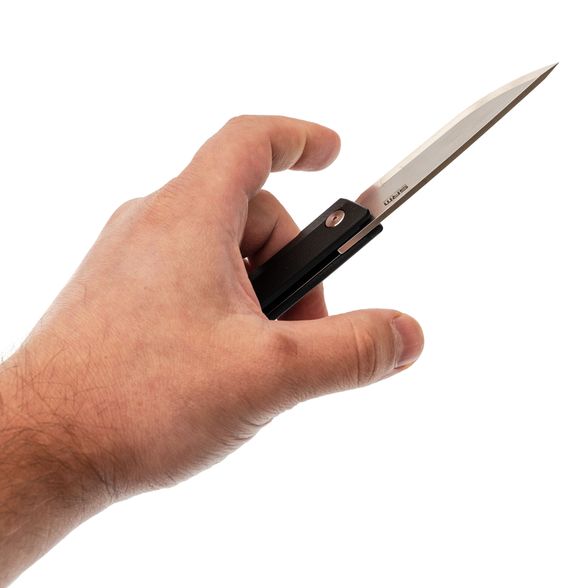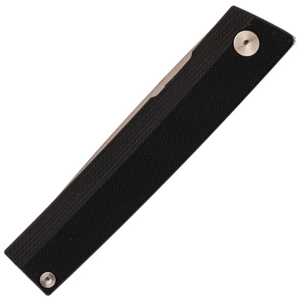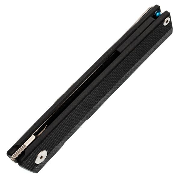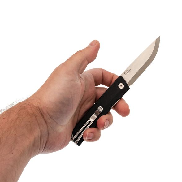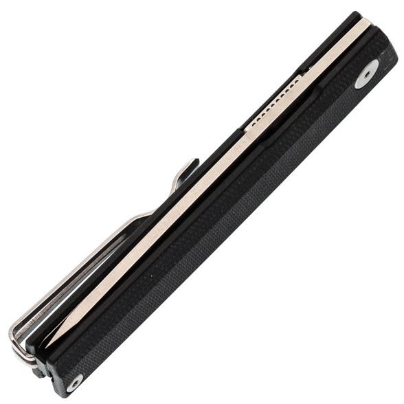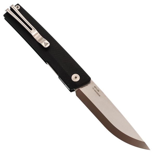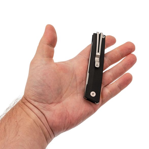 Рукоять Gent 401l-GB выполнена в чётком, прямолинейном стиле, полностью скрывая клинок в сложенном состоянии. В конструкции предусмотрена съёмная пружинная клипса Ambi Clip - её можно легко переставить или снять, нажав с обеих сторон и потянув наружу. Клипса не мешает при хвате и не утяжеляет конструкцию. Также на торце рукояти расположена аккуратная бонка - удобное решение для крепления темляка или подвеса.