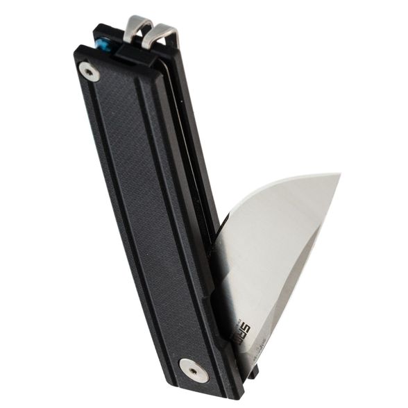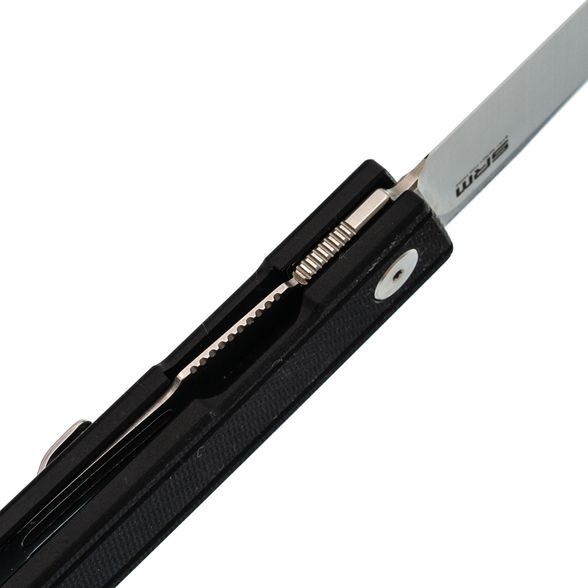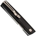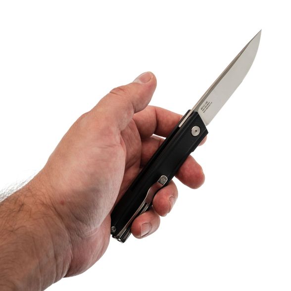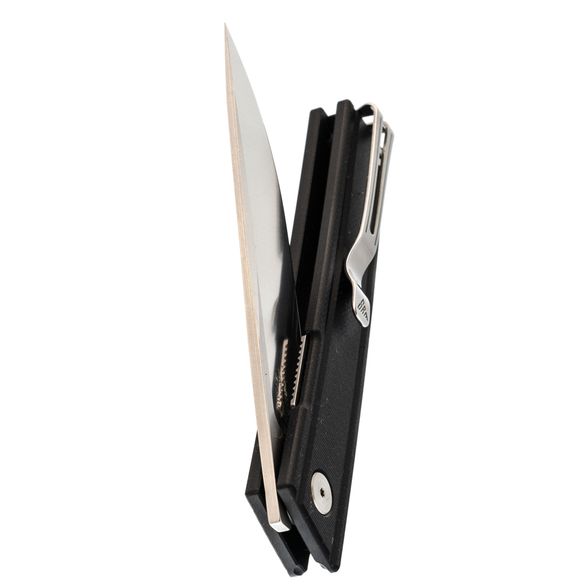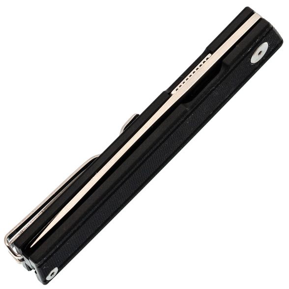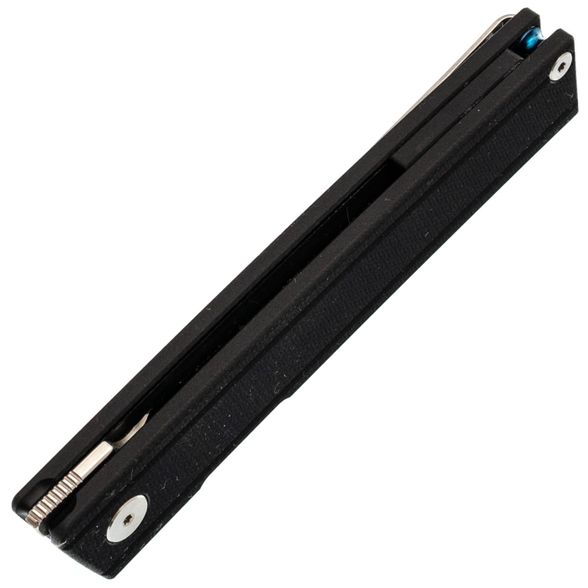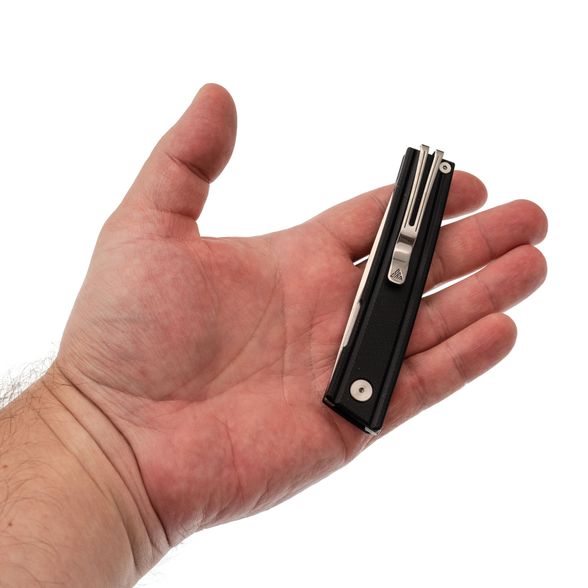 Плоский профиль с мягкими фасками и микротекстура G10 обеспечивают уверенный хват при минимальной толщине. Чёрная расцветка визуально "собирает" контур и делает изделие уместным в деловом стиле. Пружинная Ambi-Clip легко снимается и переставляется без винтов, бережно относится к кромке кармана и остаётся малозаметной. Аккуратная бонка позволяет добавить темляк.