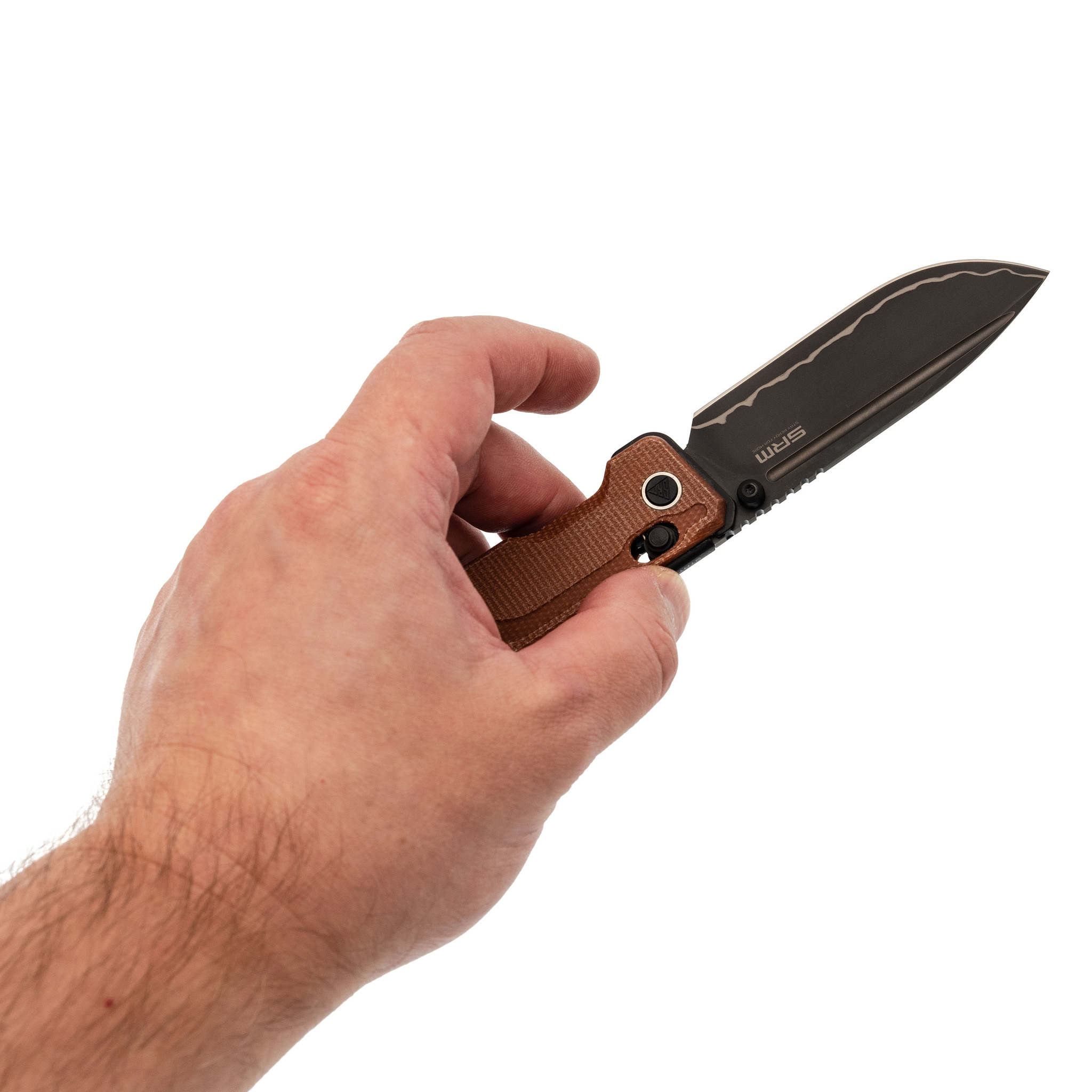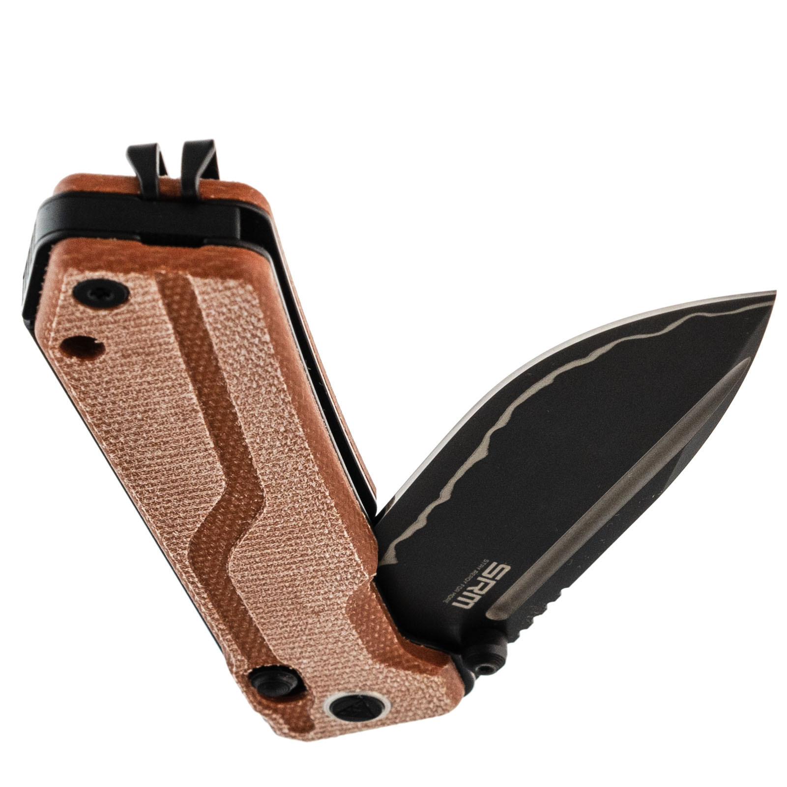 Рукоять SRM Rubik спроектирована с учетом комфорта и надежности. Благодаря цельному моно-лайнеру она выдерживает значительные нагрузки без деформаций. Микарта в качестве накладок добавляет ножу визуальной выразительности и тактильного удобства. Механизм Ambi-Lock обеспечивает простое и безопасное открывание с любой руки, а симметричный дизайн делает нож одинаково удобным для правшей и левшей.