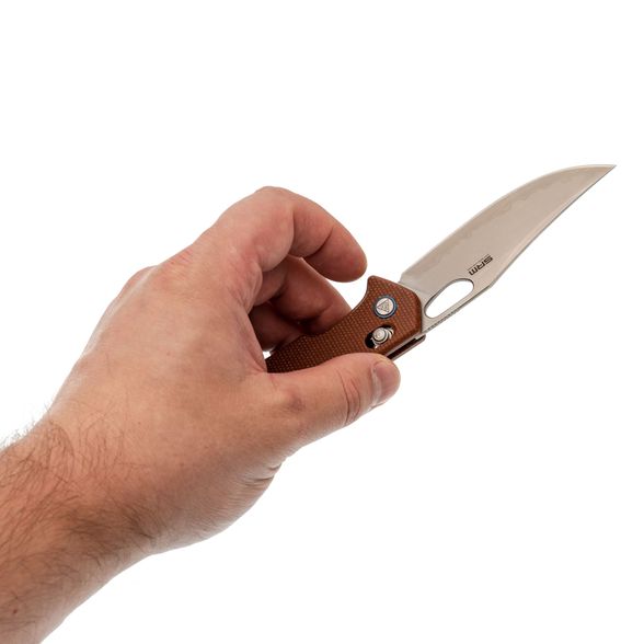 Рукоять SRM 9203 выполнена с учётом анатомии руки. Изогнутая форма и выраженная подпальцевая выемка обеспечивают надёжный хват и контроль при работе. Даже при влажной руке или в перчатке нож остаётся предсказуемым в обращении.