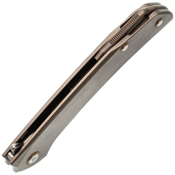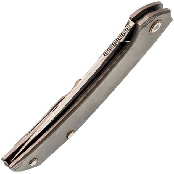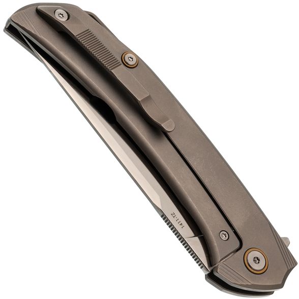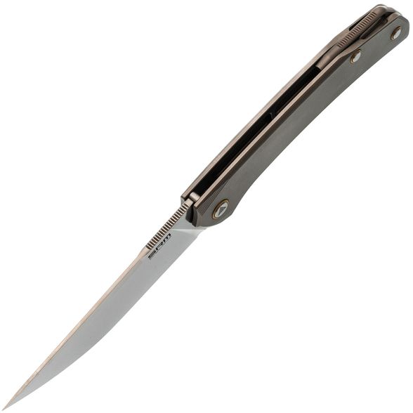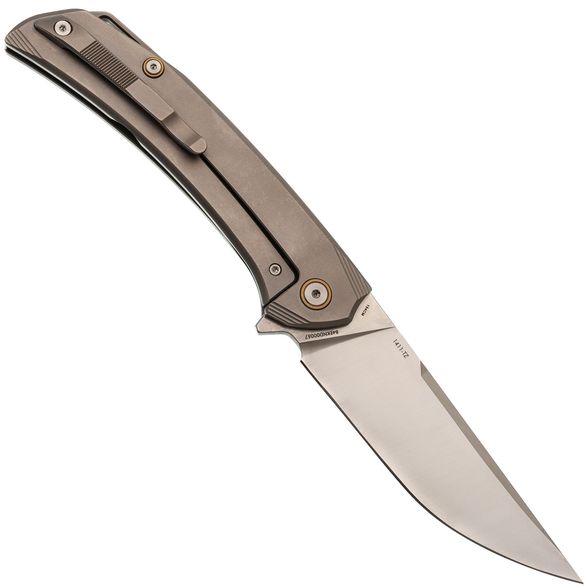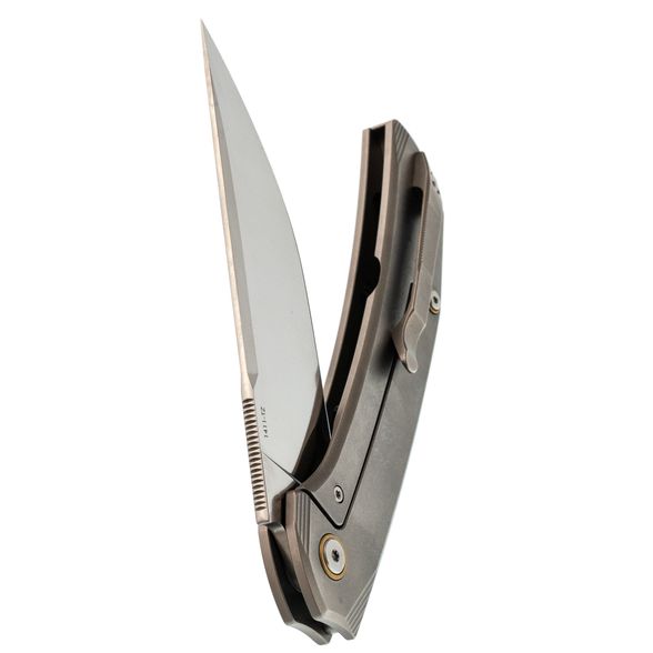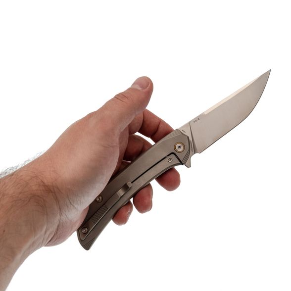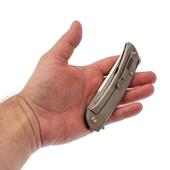 Рукоять выполнена из титана - легкого, прочного и устойчивого к внешним воздействиям материала. Эргономичная форма обеспечивает комфортное удержание ножа в руке, снижая усталость даже при длительном использовании. Поверхность приятна на ощупь и устойчива к царапинам.