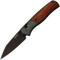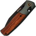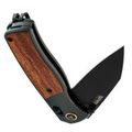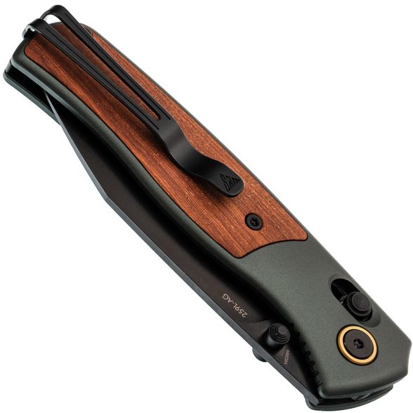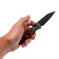 Рукоять выполнена из авиационного алюминия, что делает модель легкой и прочной. Вставка из Rosewood (палисандра) не только делает рукоять красивой, но и добавляет тепло в ощущениях при использовании. Удобная форма рукояти хорошо ложится в руку, а наличие клипсы позволяет удобно носить нож на кармане.