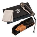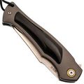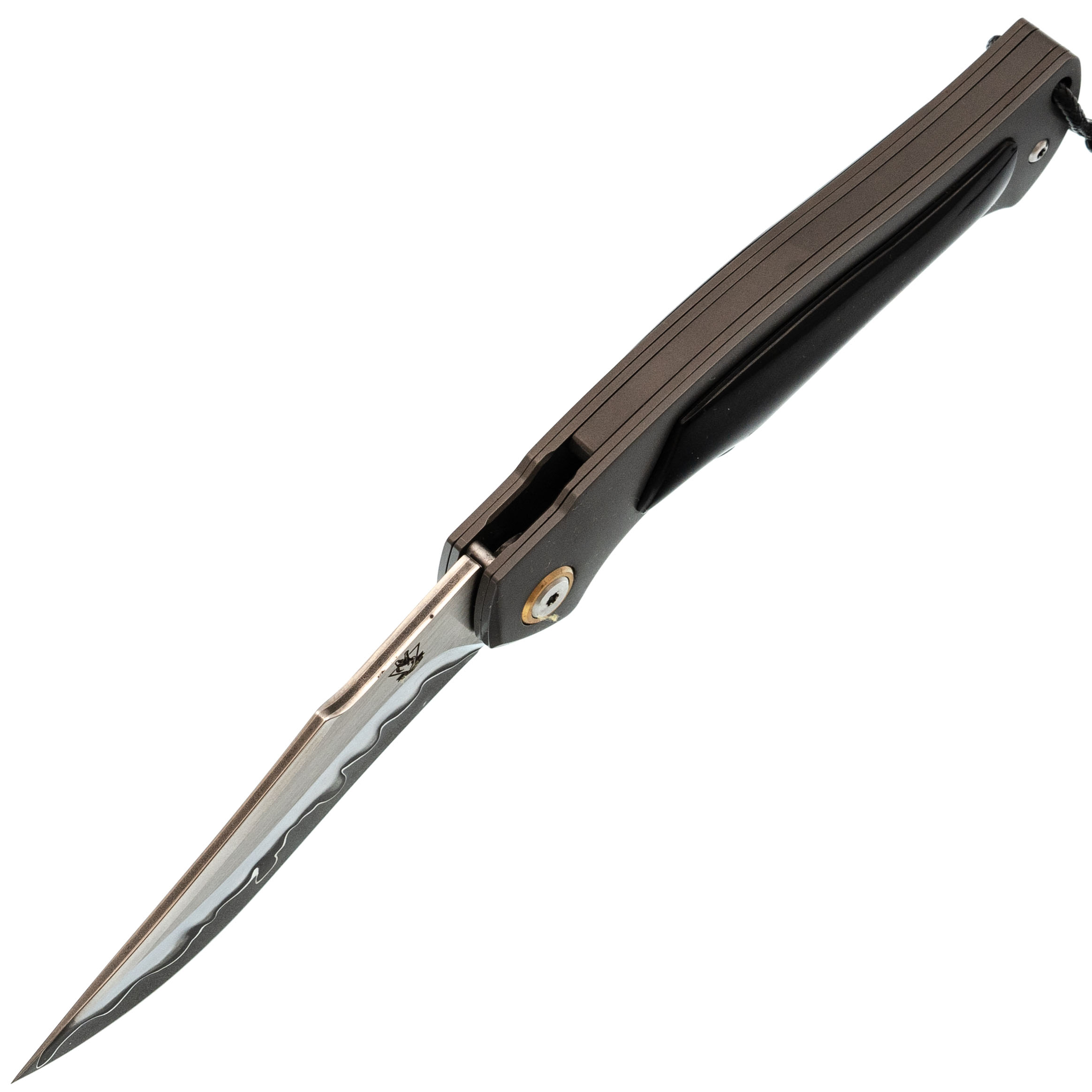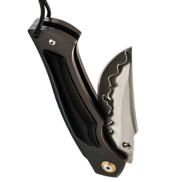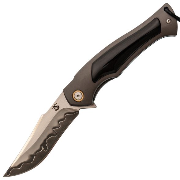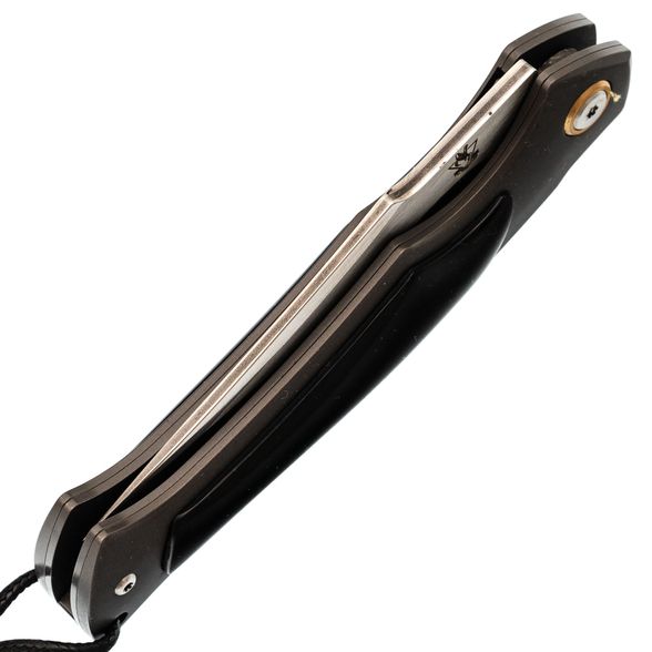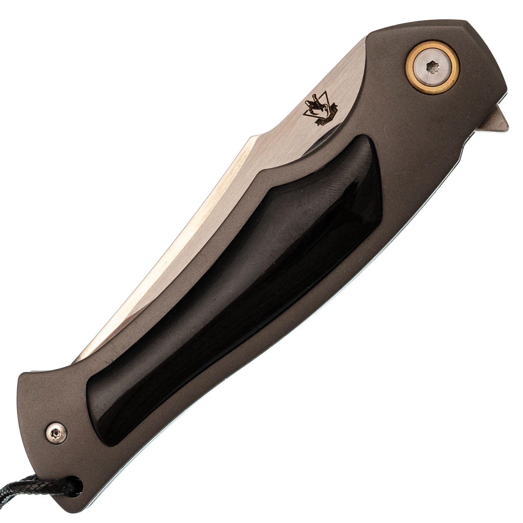 Форма рукояти заточена под повседневное использование: есть подпальцевая выемка, благодаря которой нож сидит уверенно и предсказуемо, без лишнего напряжения кисти. Сочетание металлов даёт ощущение собранности, а накладка из рога добавляет изящности и приятной фактуры - та самая деталь, из-за которой нож хочется чаще брать в руки. Предусмотрено темлячное отверстие - полезно, если любишь быстрый извлекаемый хват или просто хочешь персонализировать внешний вид.