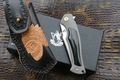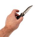 Профиль Clip-Point здесь выглядит хищно, но работает по делу: удобен и для контролируемого реза, и для аккуратных подрезов. Высокие прямые спуски, тонкое сведение и рекурва помогают ножу охотно вгрызаться в материал - особенно это заметно на плотном картоне, пластике и на бытовых задачах, где важна лёгкость хода. Флиппер открывает клинок быстро и интуитивно: достал - щёлк - работаешь.