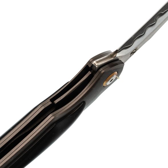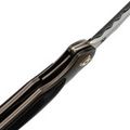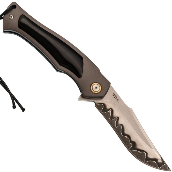 - Ламинат клинка с сердечником SKD11 (аналог D2) - сердечник отвечает за рабочую вязкость кромки и уверенную стойкость заточки. Эта сталь любит аккуратную правку и в целом ценится за то, что держит рез долго при обычных EDC-нагрузках.