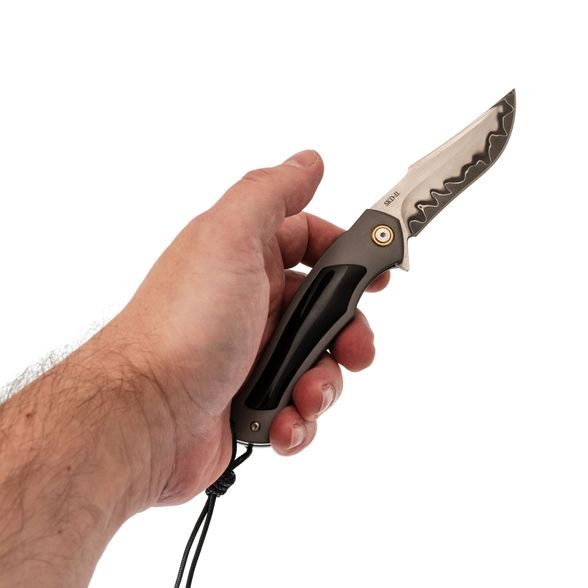 - Сталь и алюминий в рукояти - сталь добавляет ощущения монолитности и ресурса, а алюминий помогает не превращать нож в кирпич в кармане и делает хват более комфортным по весу.