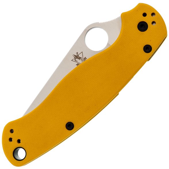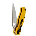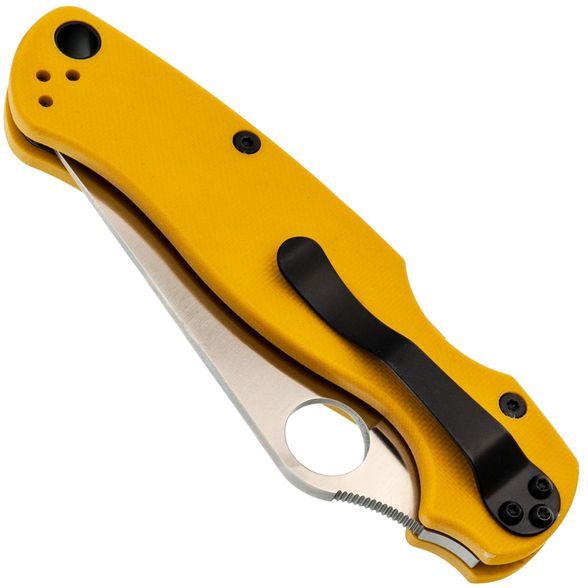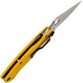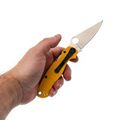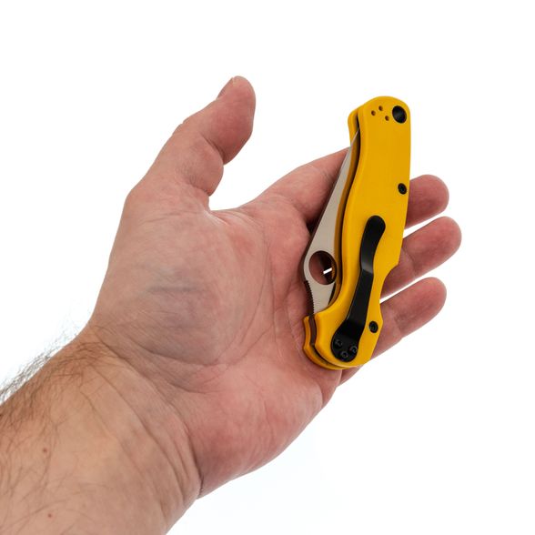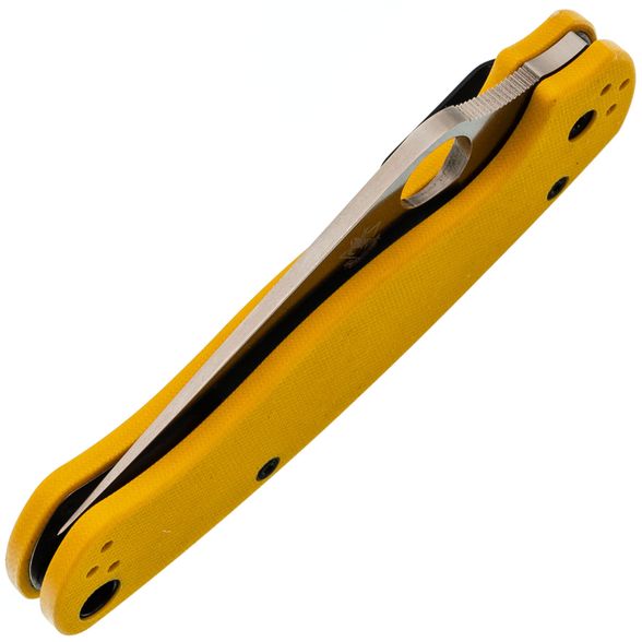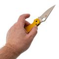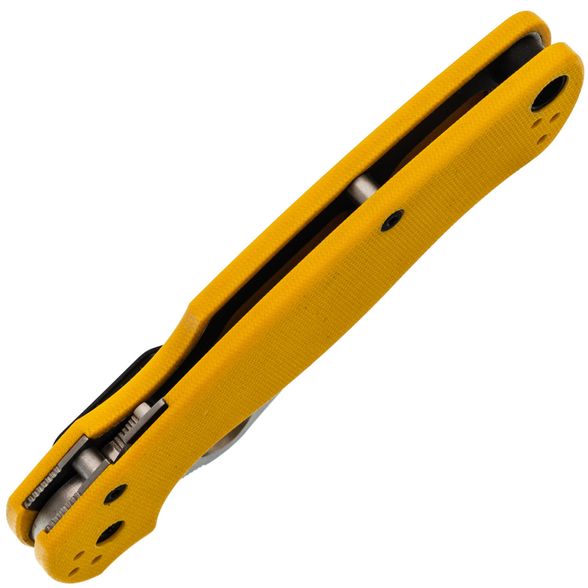 Рукоять ножа изготовлена из стеклотекстолита G10, который отличается прочностью, лёгкостью и устойчивостью к внешним воздействиям. Яркий желтый цвет рукояти делает нож заметным в городской среде, а её эргономичная форма обеспечивает удобство в работе. Замок Compression-Lock, схожий с Liner-Lock, но более надёжный, позволяет безопасно закрывать и открывать нож, не подставляя пальцы под клинок. Клипса переставляется в любую из четырёх позиций, а также имеется темлячное отверстие для дополнительного удобства.