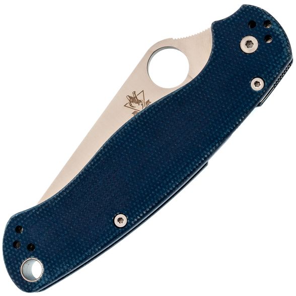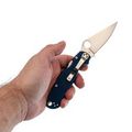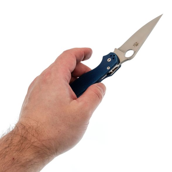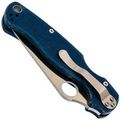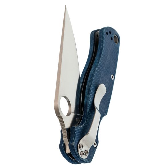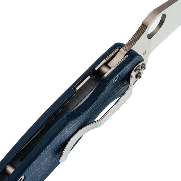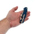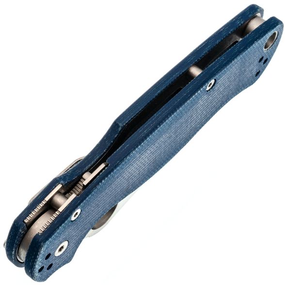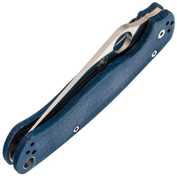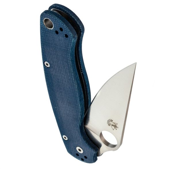 Рукоять выполнена из синей микарты – материала, который отличается прочностью, лёгкостью и бархатистой текстурой, приятной на ощупь и не охлаждающей руку. Эргономичная форма рукояти обеспечивает удобный хват в разных положениях. Благодаря плоскому профилю, нож незаметен в кармане. За фиксацию клинка отвечает замок Compression-Lock, который крепко удерживает лезвие в рабочем положении. Ещё одна приятная особенность замка - возможность инерционного открытия, а для закрытия не нужно подставлять пальцы под клинок, что повышает общий уровень безопасности. Карманная клипса переставляется в четыре положения, предусмотрено темлячное отверстие.