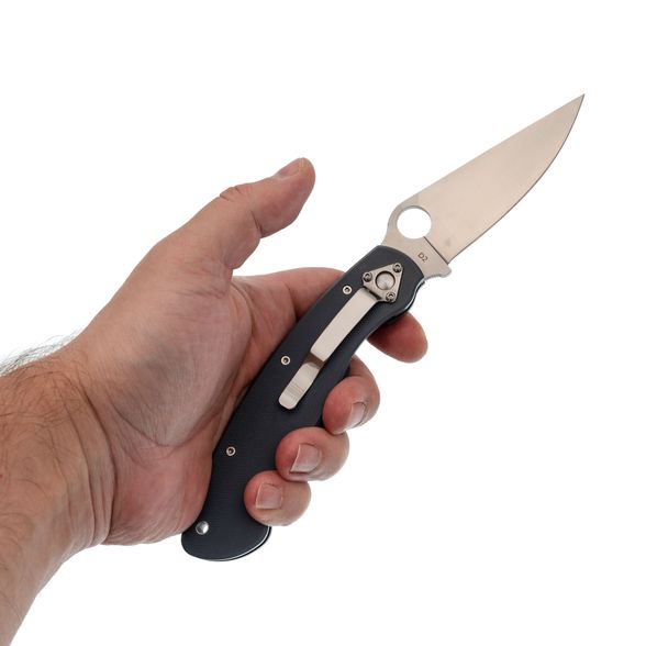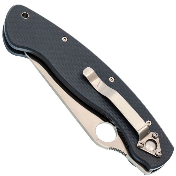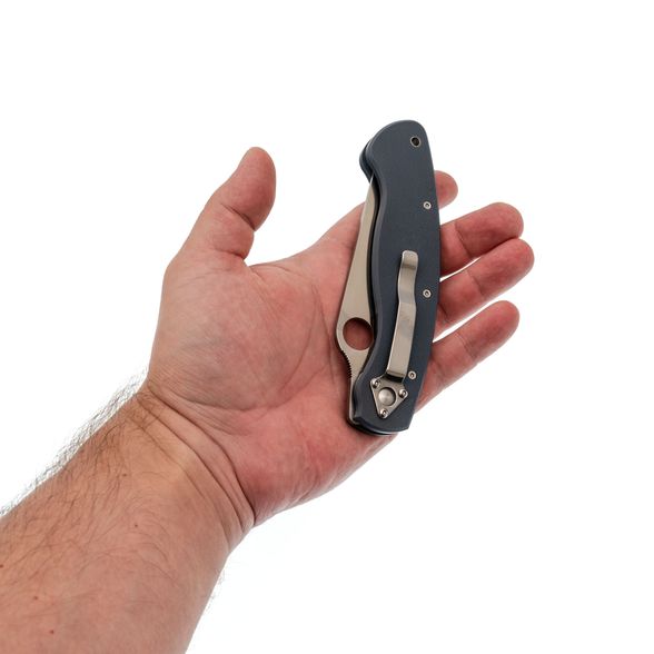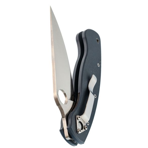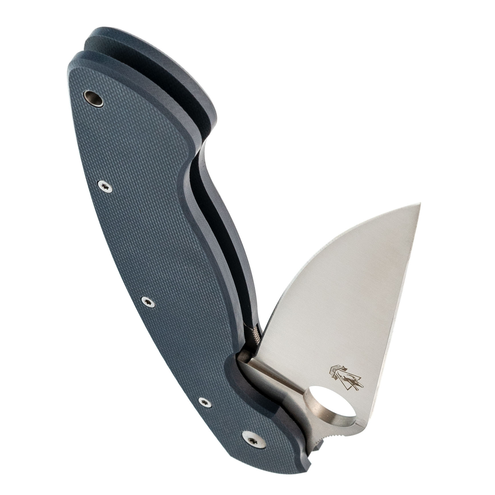 Рукоять выполнена с выраженной эргономикой: изогнутая форма и подпальцевая выемка обеспечивают надёжное удержание. Серая накладка из G10 не только прочная, но и приятная на ощупь. Для переноски предусмотрена карманная клипса и отверстие под темляк, которое можно использовать и для декора.
