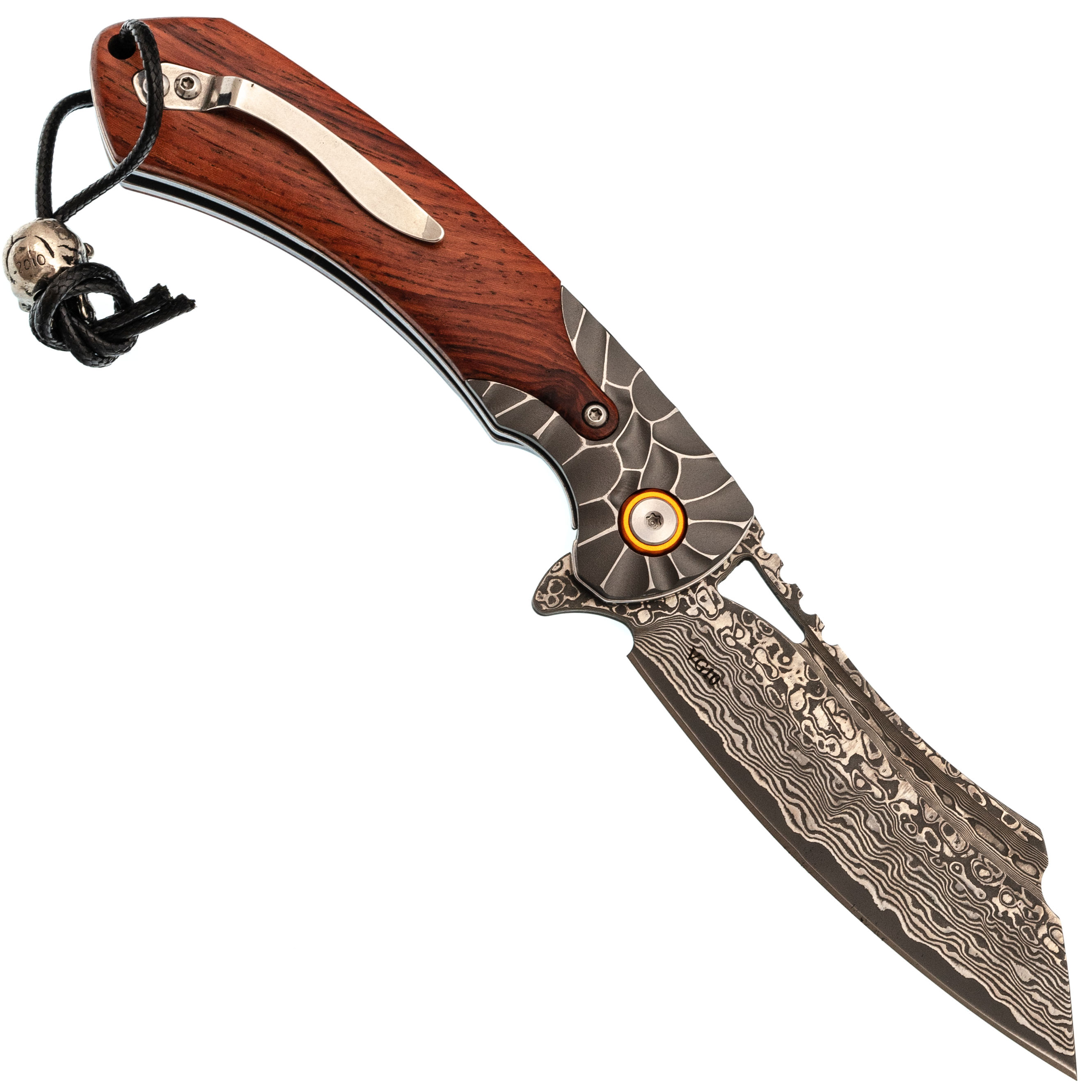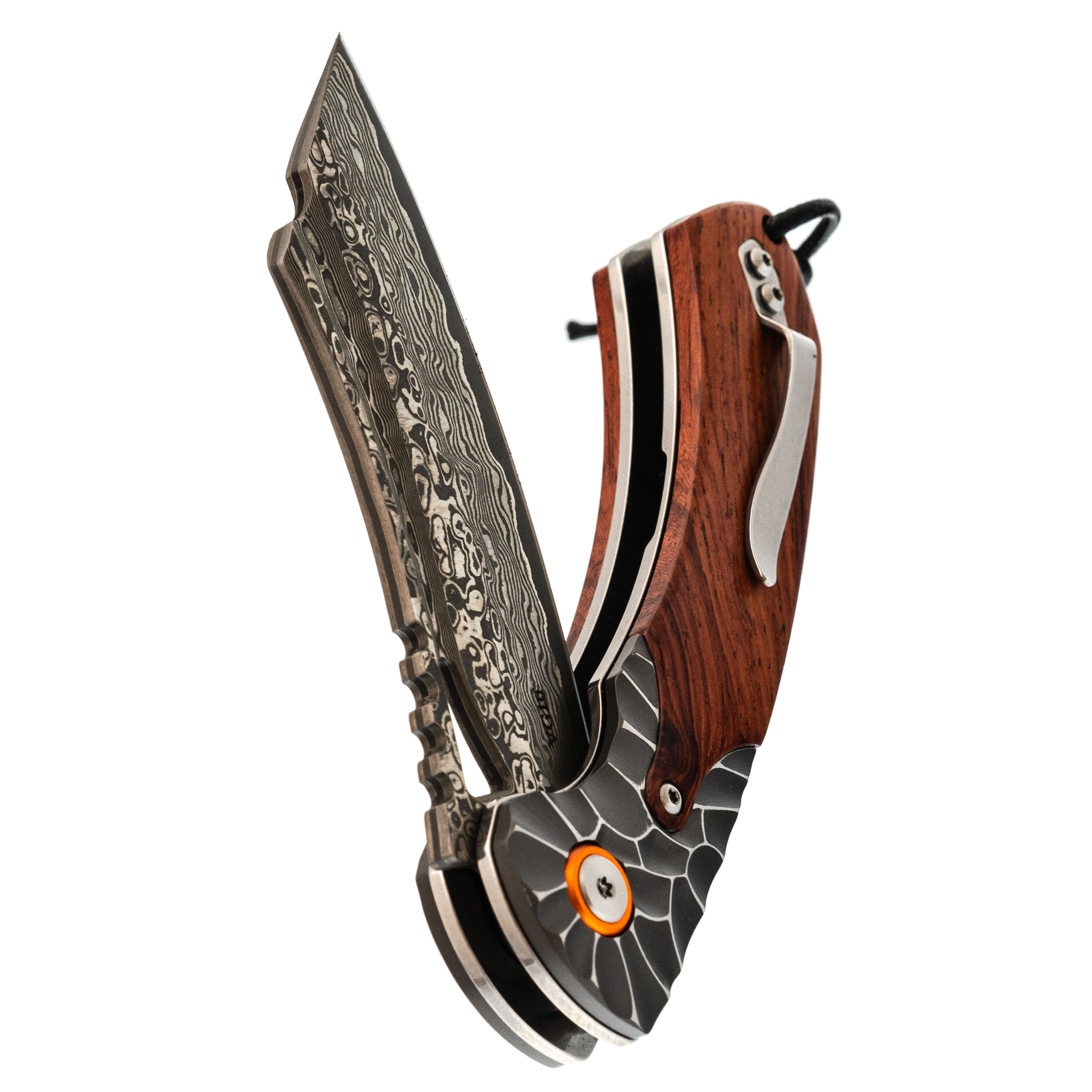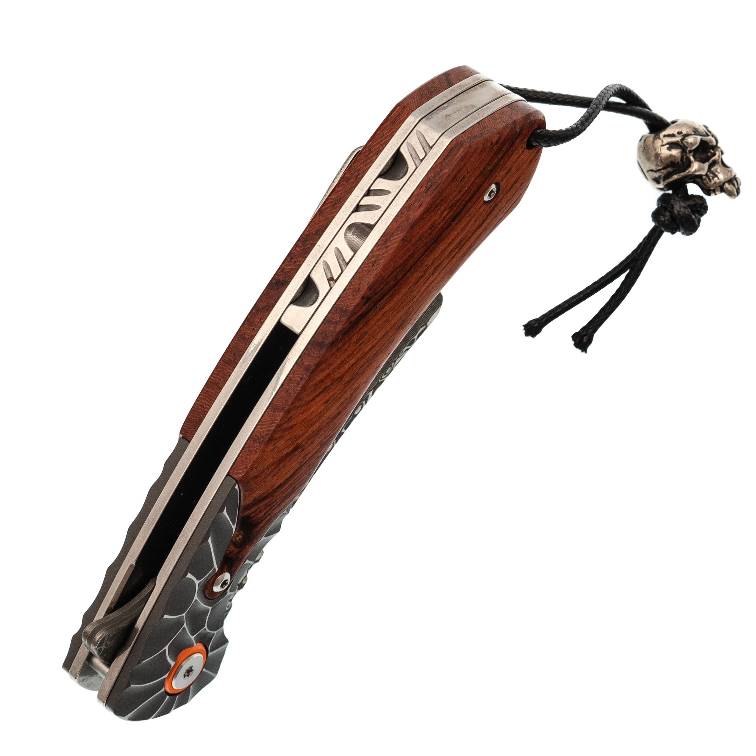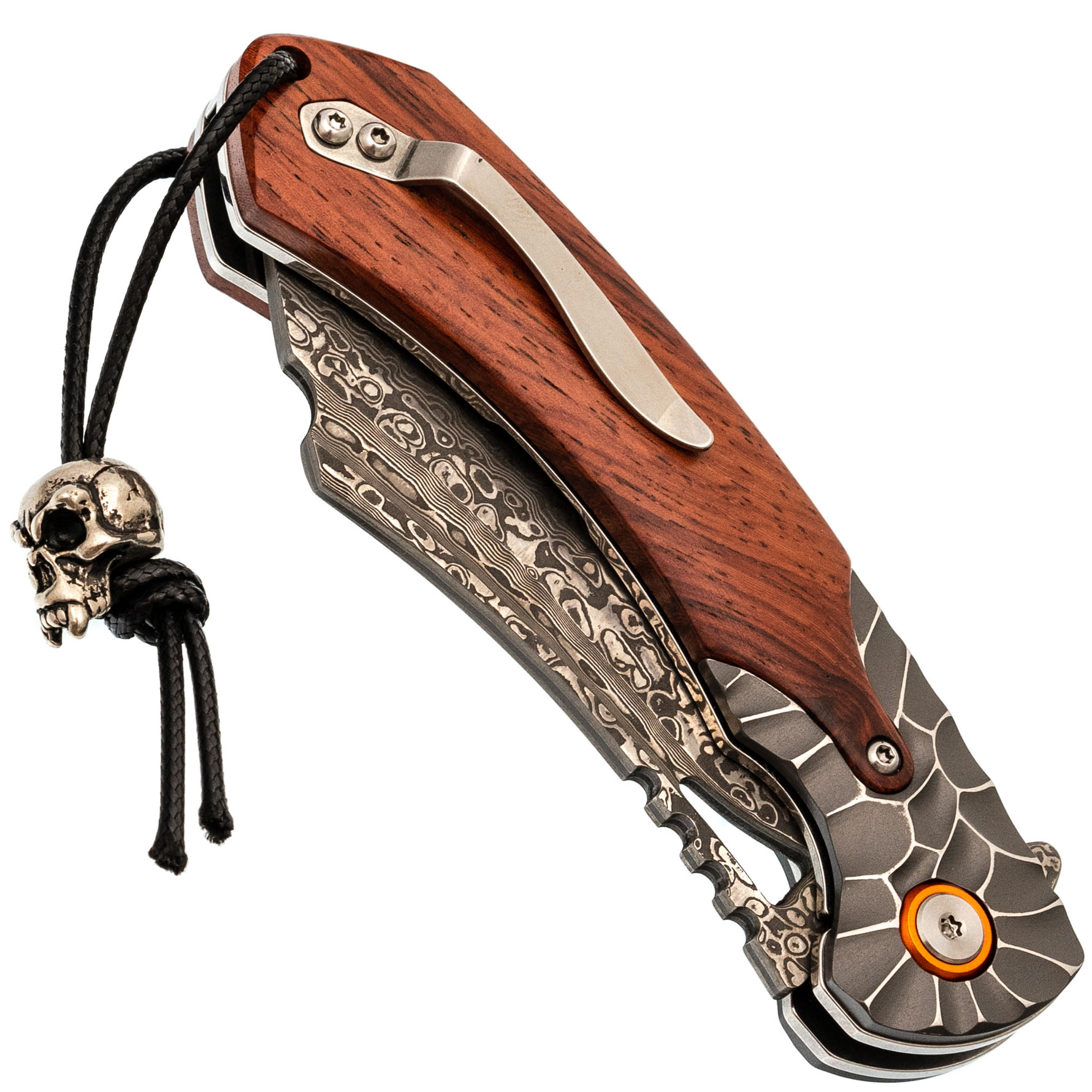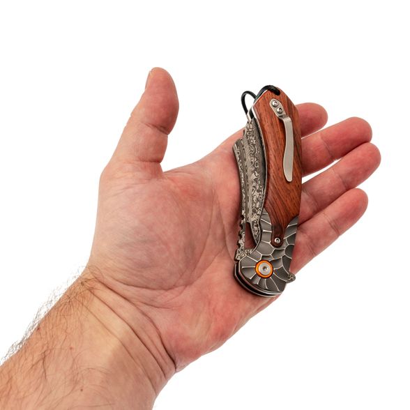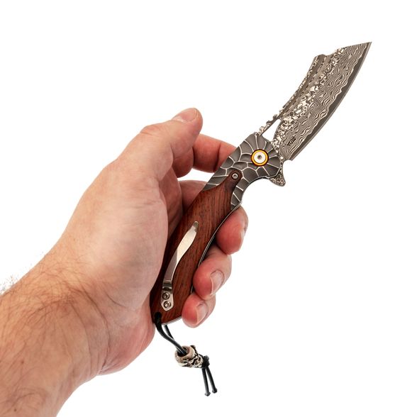 Изогнутая эргономичная рукоять хорошо ложится в руку и не заставляет подстраиваться - особенно когда работаешь в движении. Комбинация стали и красного дерева даёт приятный баланс: визуально тепло, по ощущению - надежно. Есть темлячное отверстие для шнура, а карманная клипса позволяет носить нож так, как удобнее в городе - просто закрепил и забыл.