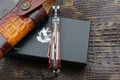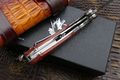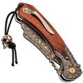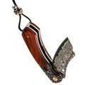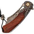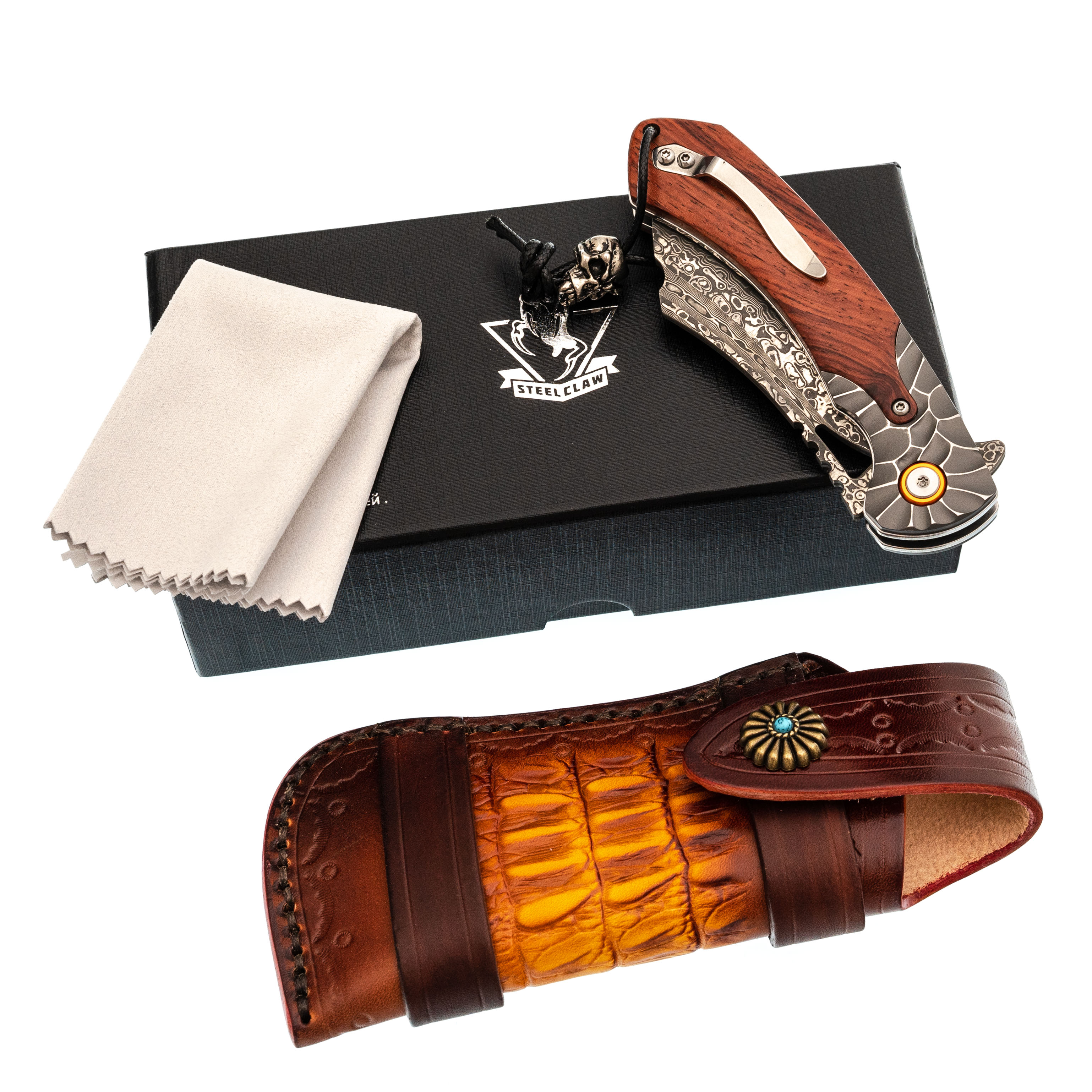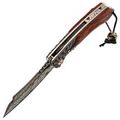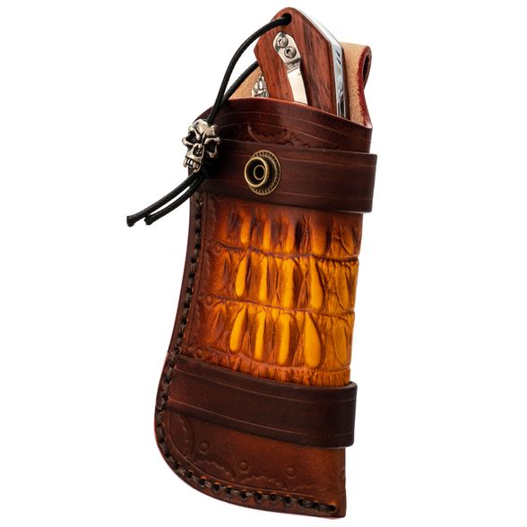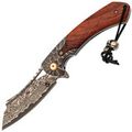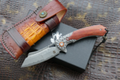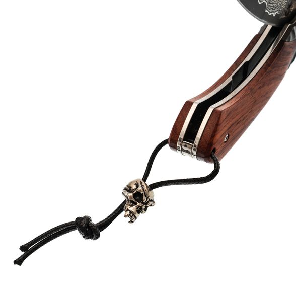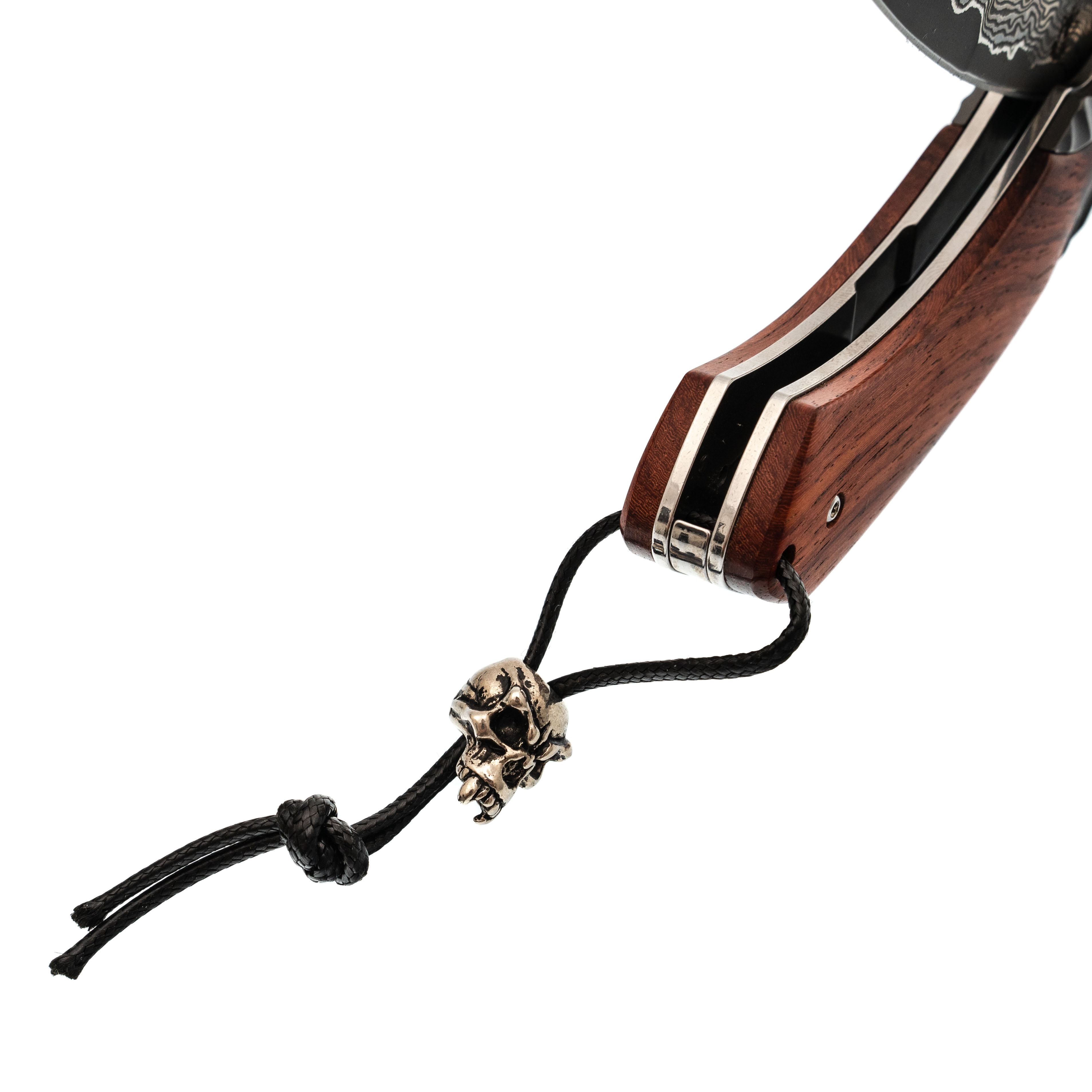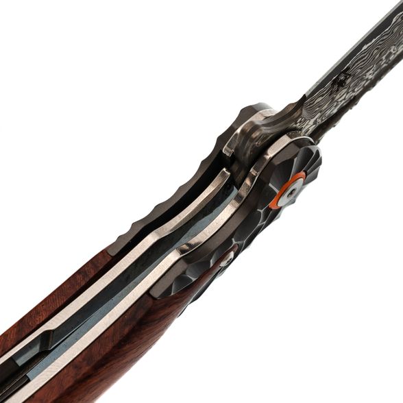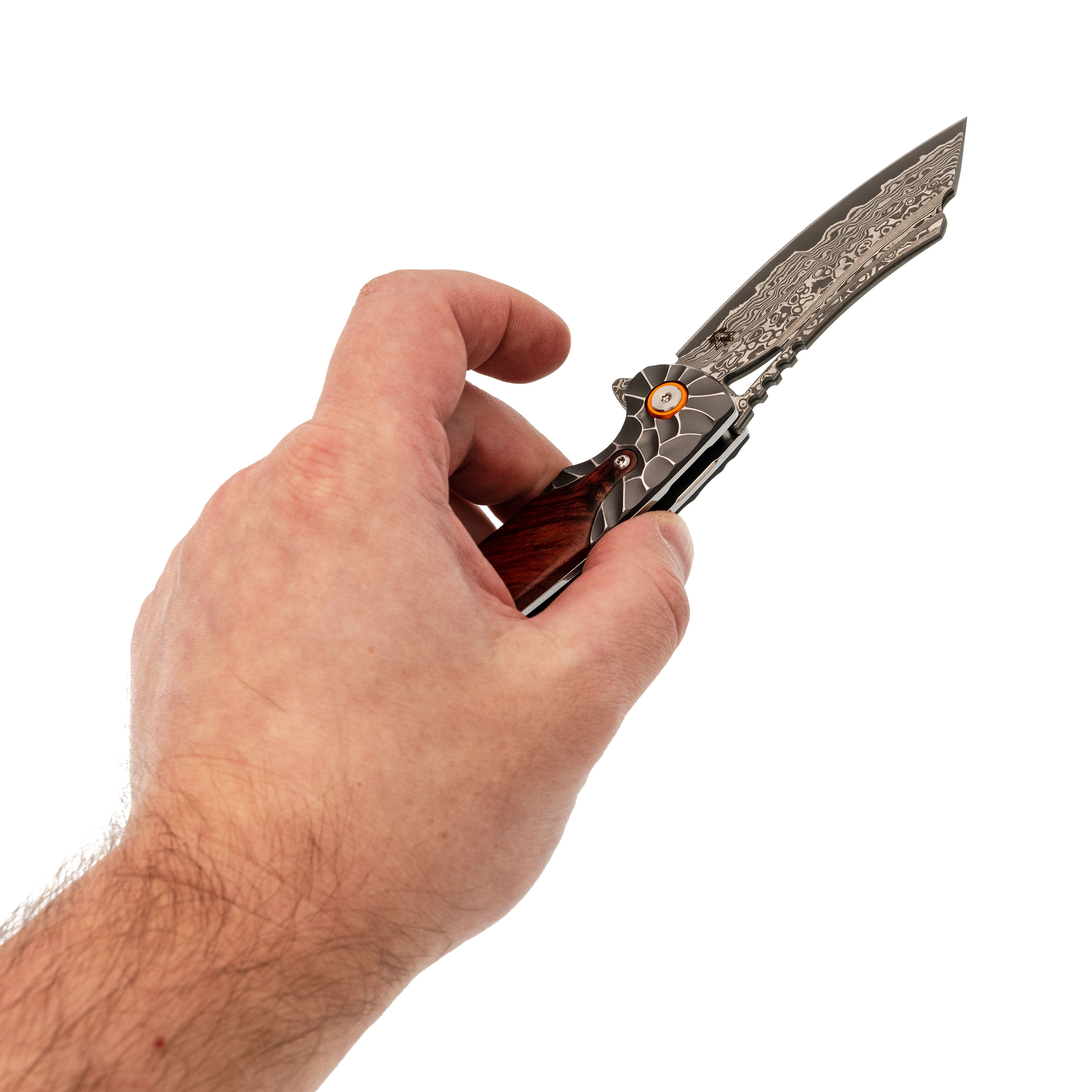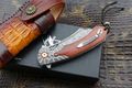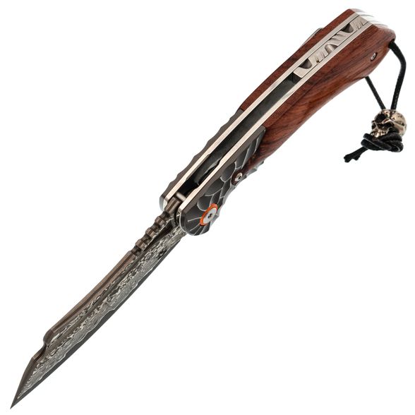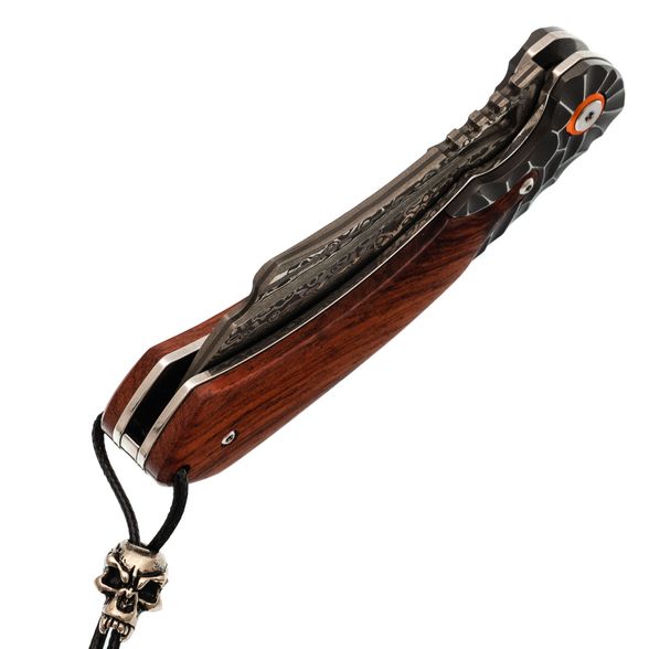 Изогнутая эргономичная рукоять хорошо ложится в руку и не заставляет подстраиваться - особенно когда работаешь в движении. Комбинация стали и красного дерева даёт приятный баланс: визуально тепло, по ощущению - надежно. Есть темлячное отверстие для шнура, а карманная клипса позволяет носить нож так, как удобнее в городе - просто закрепил и забыл.