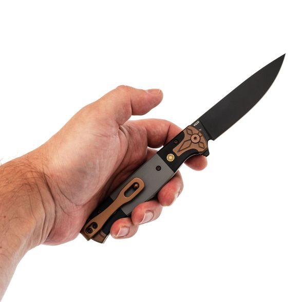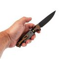 Клинок профиля Drop‑point сочетает удобство при выполнении разнообразных задач с прочностью кончика, способного выдерживать значительные нагрузки. Толщина обуха 3,5 мм придает конструкции дополнительную жесткость, а обработка BlackWash создает матовую текстуру, которая скрывает следы эксплуатации и подчеркивает утилитарный стиль изделия.