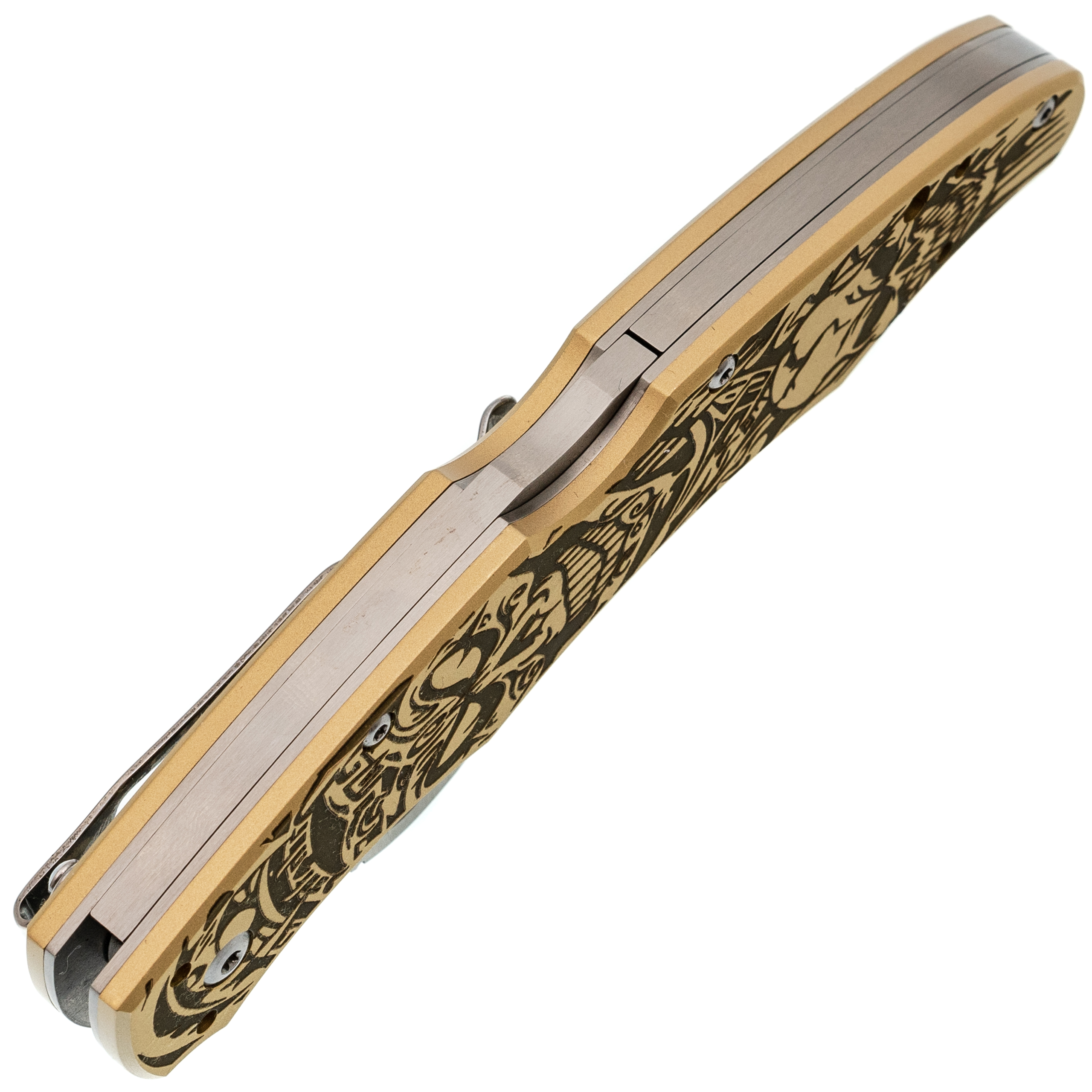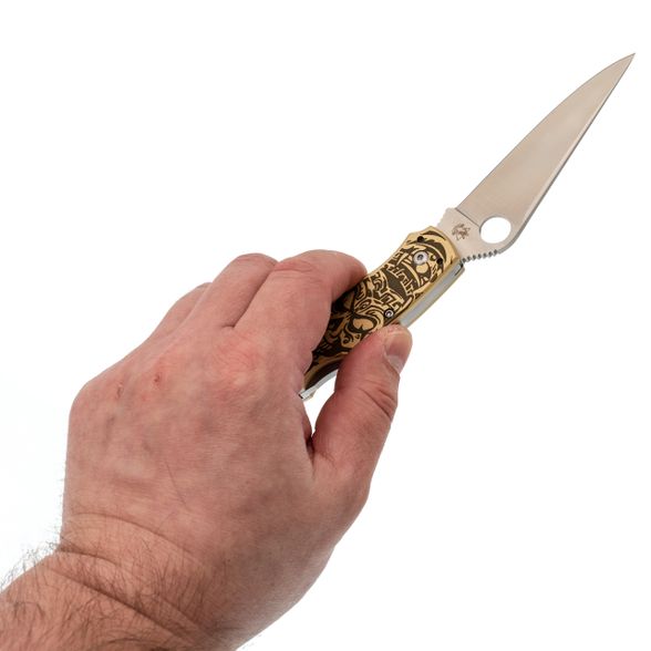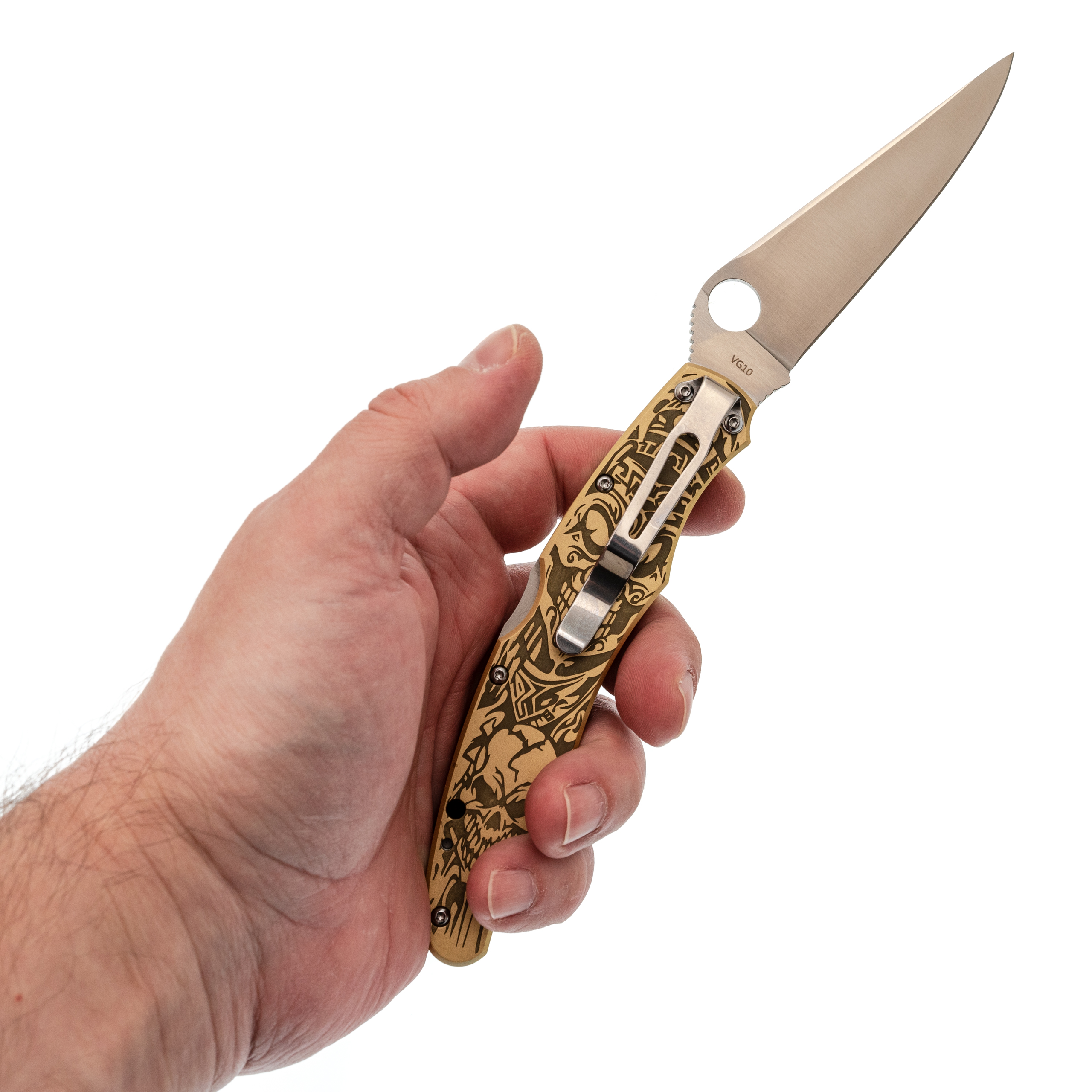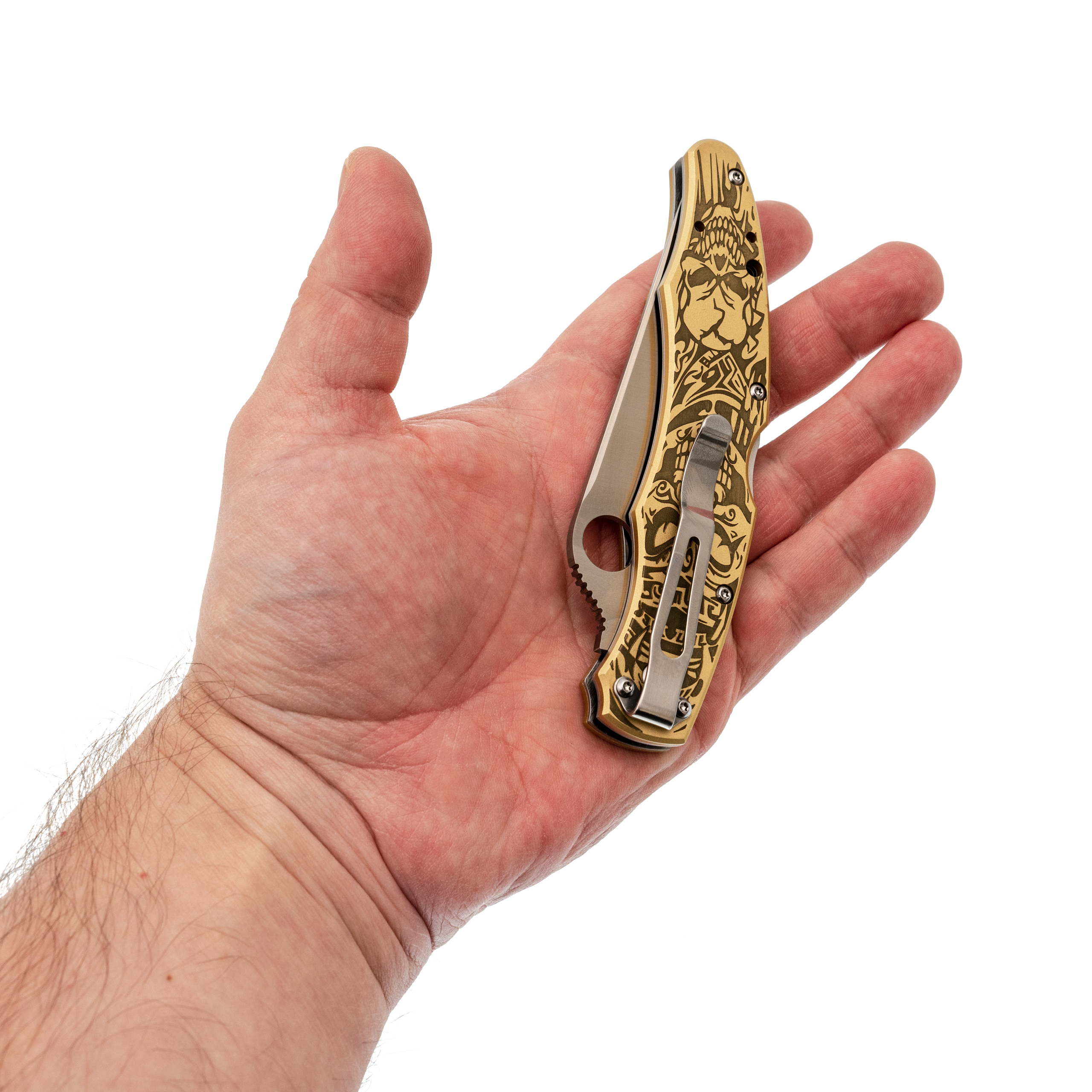 Рукоять с выраженной анатомией уверенно ложится в ладонь и не скользит. Подпальцевые выемки фиксируют хват, а чойл позволяет перехватиться для точной работы. Латунные накладки с глубокой гравировкой придают модели брутальный внешний вид и делают её заметной. Клипса с четырьмя вариантами установки позволяет настроить ношение под себя.