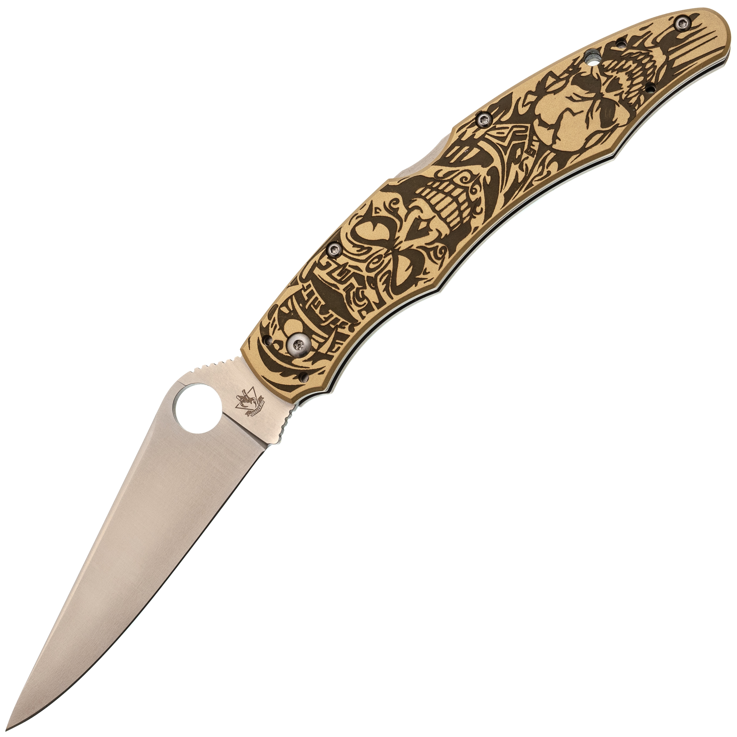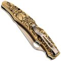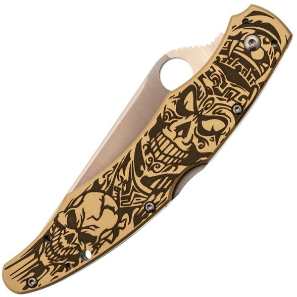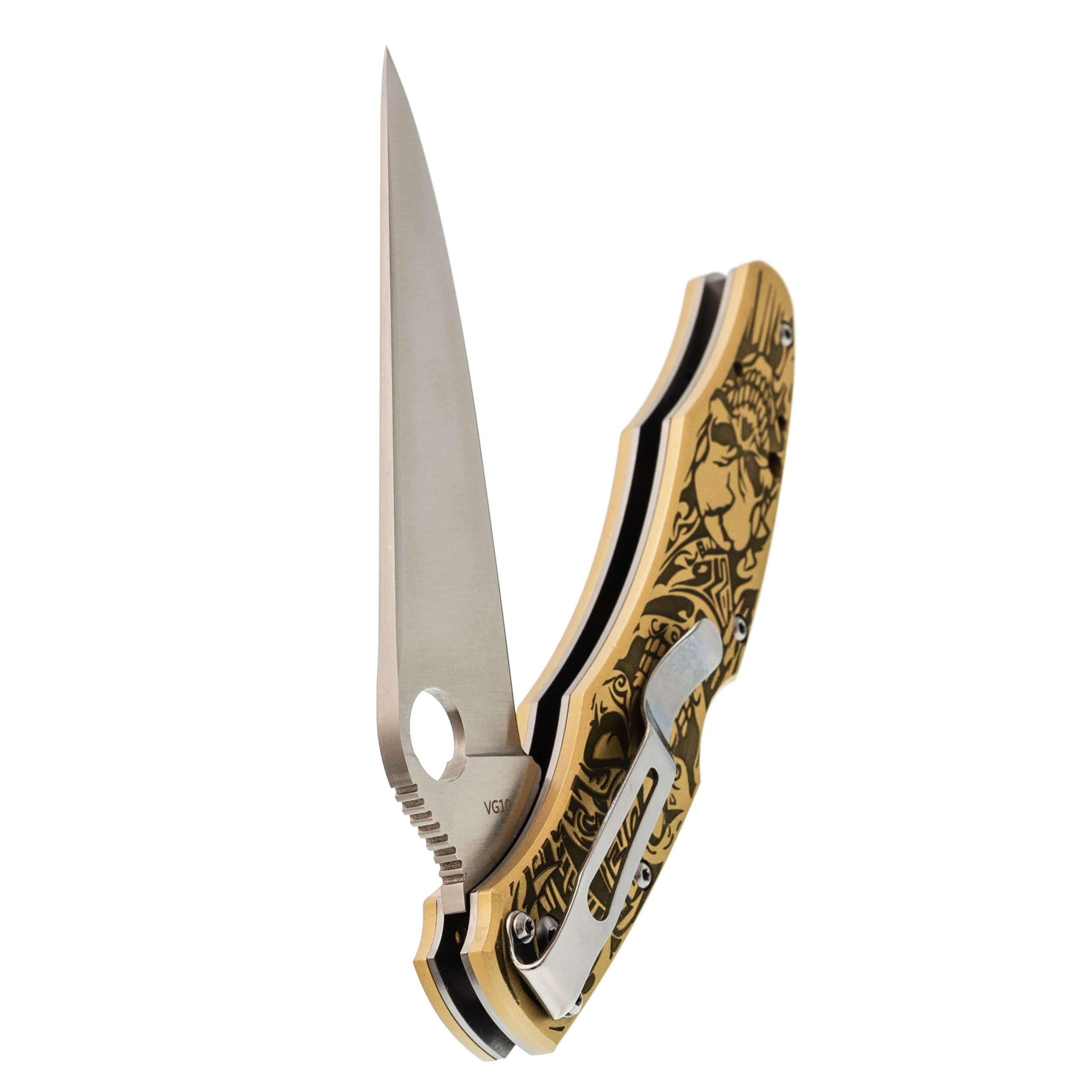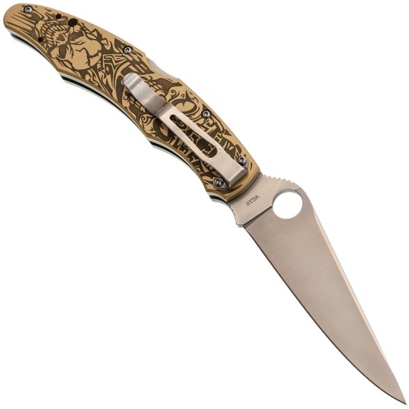 Рукоять с выраженной анатомией уверенно ложится в ладонь и не скользит. Подпальцевые выемки фиксируют хват, а чойл позволяет перехватиться для точной работы. Латунные накладки с глубокой гравировкой придают модели брутальный внешний вид и делают её заметной. Клипса с четырьмя вариантами установки позволяет настроить ношение под себя.
