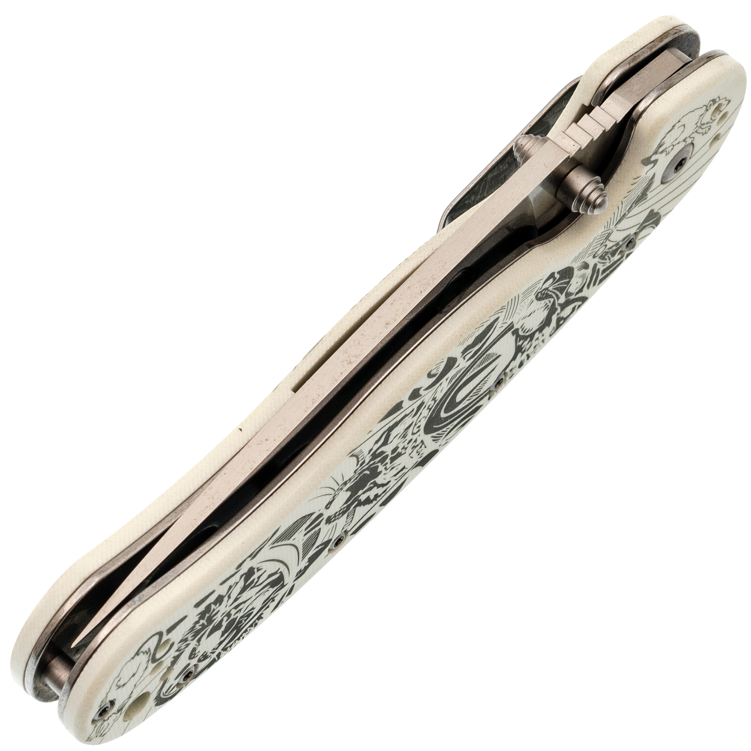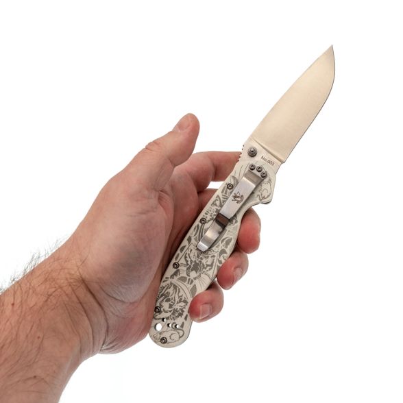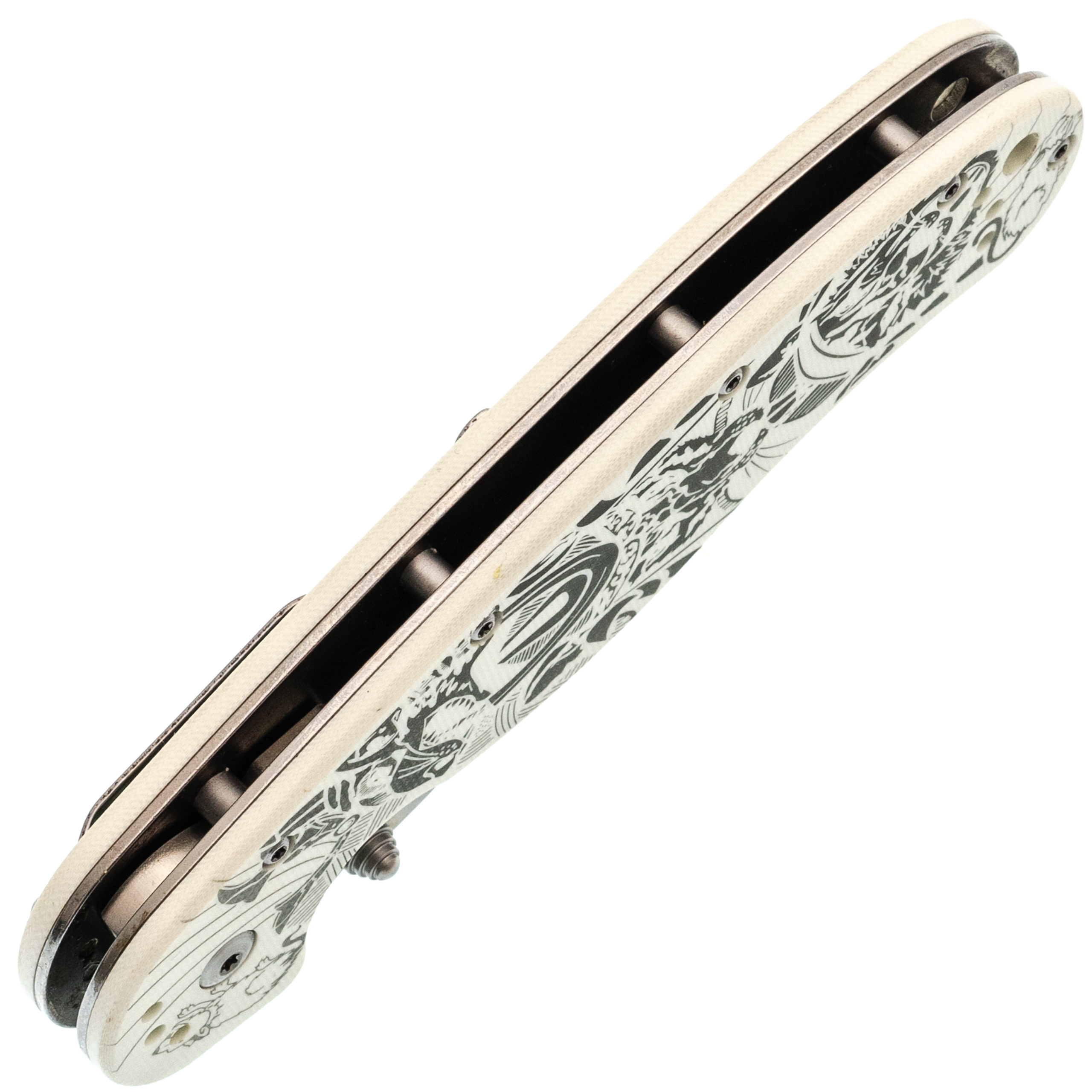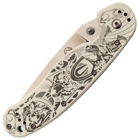 Плавные фаски, заполненная ладонь и выраженный крупный упор создают безопасное удержание при силовом резе и тонких манипуляциях. Белый G10 с "самурайскими крысами" визуально минималистичен и тактильно цепкий. Конструкция на стальных лайнерах повышает прочность, а четырёхпозиционная клипса позволяет настроить посадку "под себя".