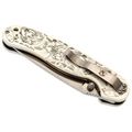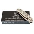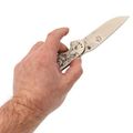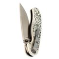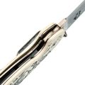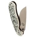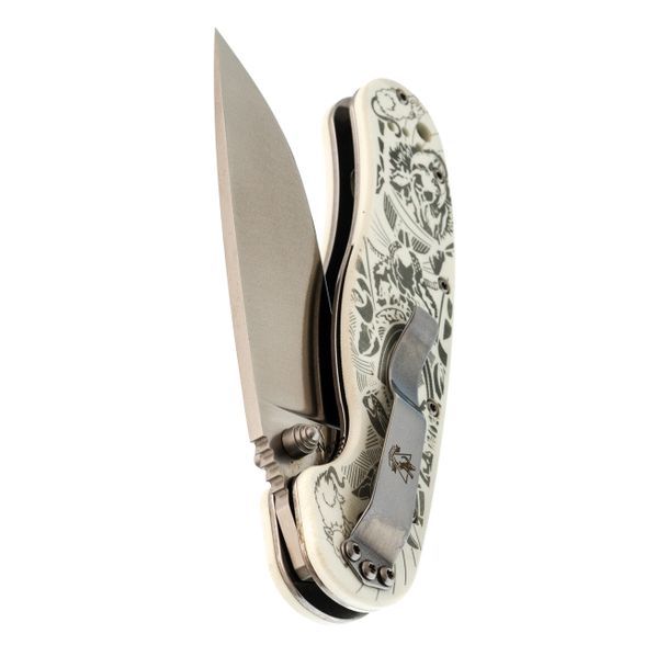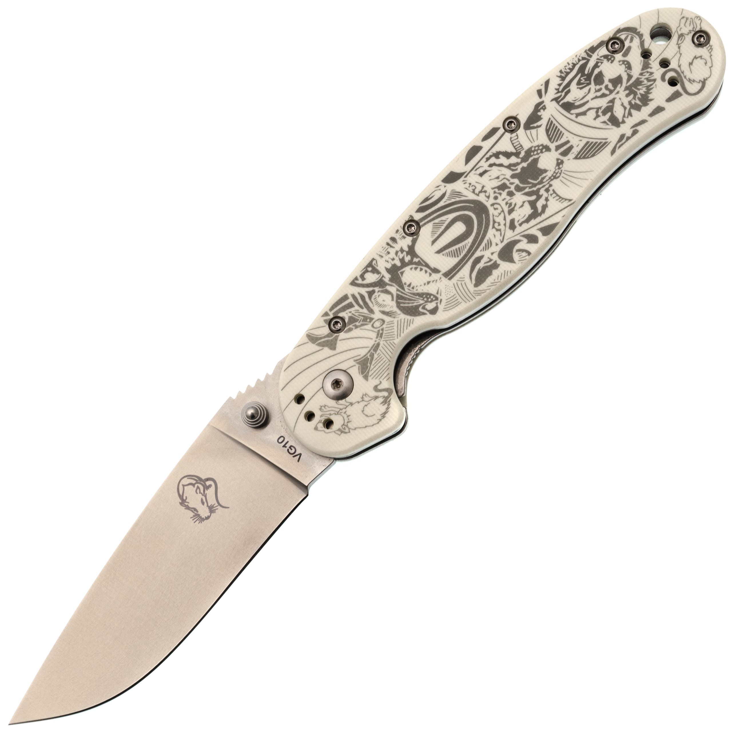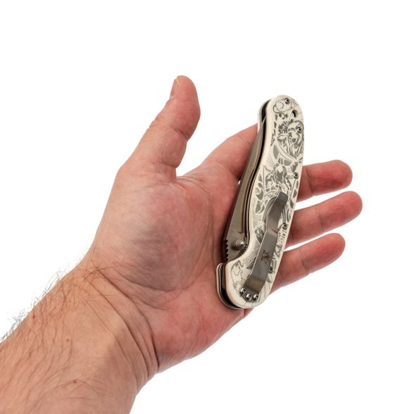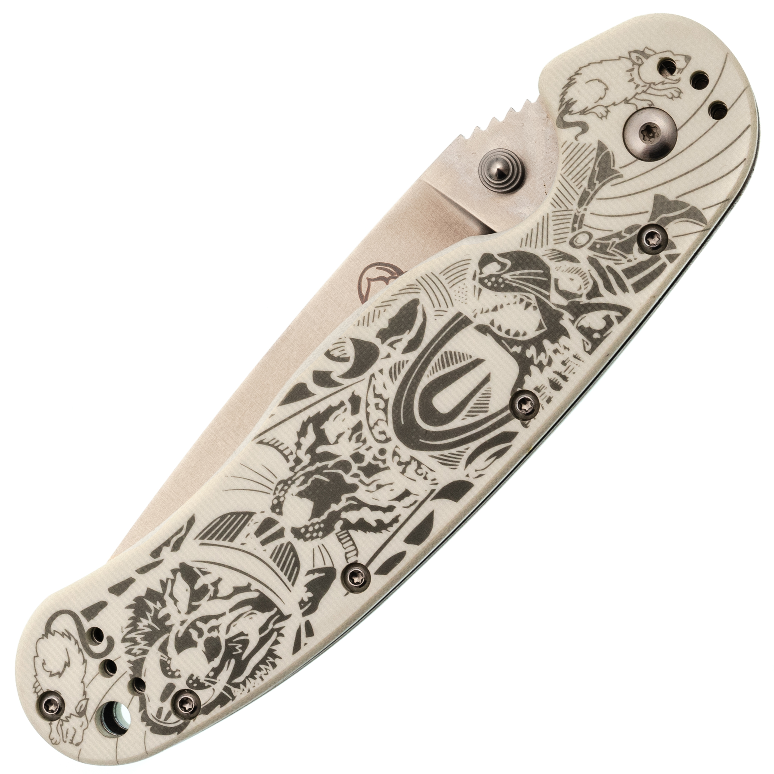 Плавные фаски, заполненная ладонь и выраженный крупный упор создают безопасное удержание при силовом резе и тонких манипуляциях. Белый G10 с "самурайскими крысами" визуально минималистичен и тактильно цепкий. Конструкция на стальных лайнерах повышает прочность, а четырёхпозиционная клипса позволяет настроить посадку "под себя".