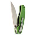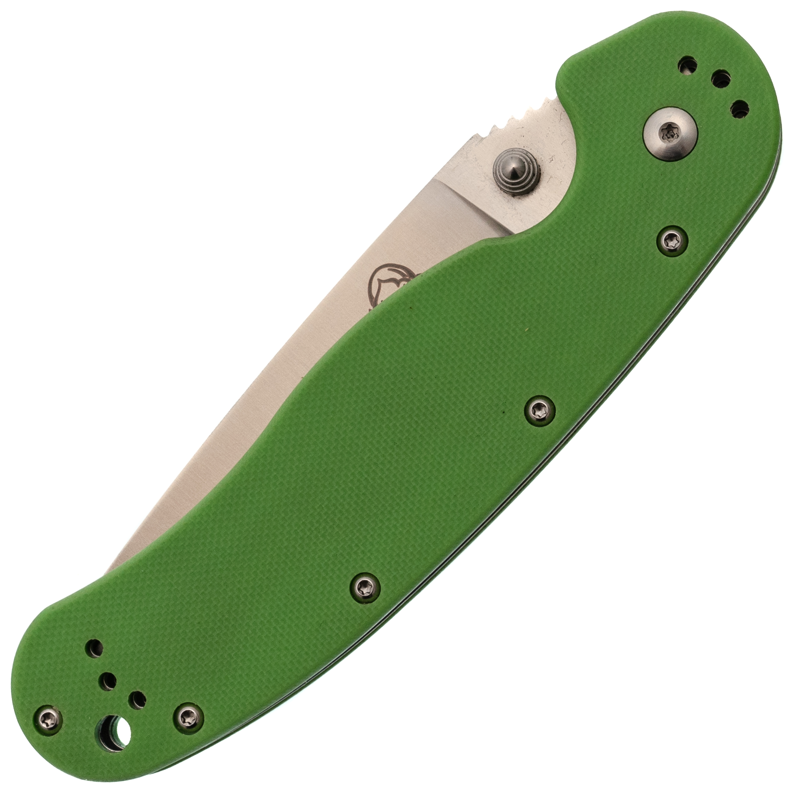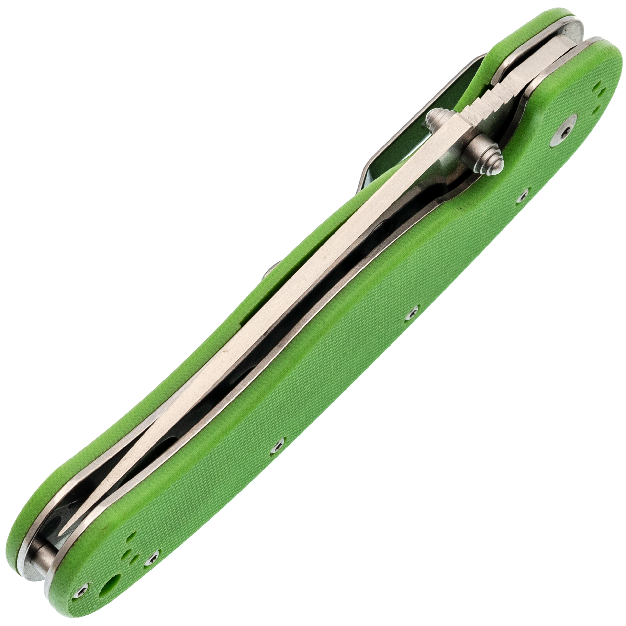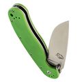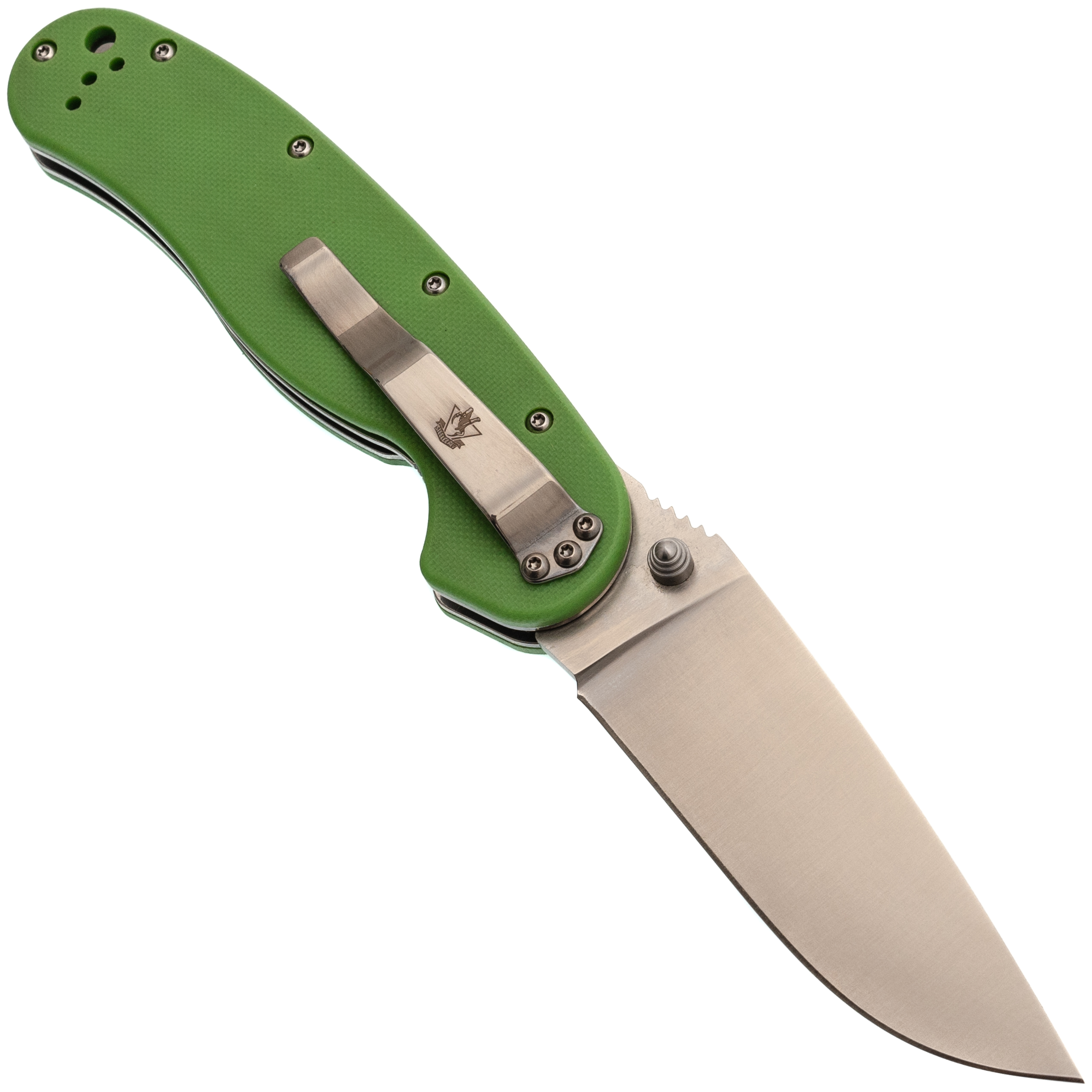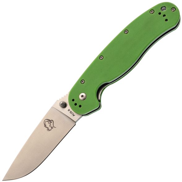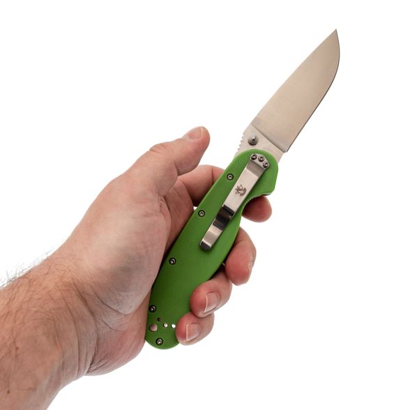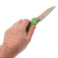 Зелёная рукоять из G10 - классика для инструментов, которые живут не только дома. Цвет практичный, немаркий. Эргономика рукояти продумана до мелочей: она имеет анатомический изгиб, который заполняет ладонь. Даже если работать долго, рука не устаёт, а на рукояти нет острых граней, которые могли бы впиваться. Хват можно менять в зависимости от задачи: хочешь резать - бери обычный, нужно точное движение - выноси указательный палец на обух. Темлячное отверстие позволяет закрепить страховочный темляк, чтобы нож не потерять в воде или высокой траве.