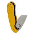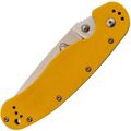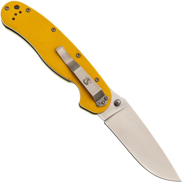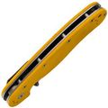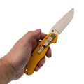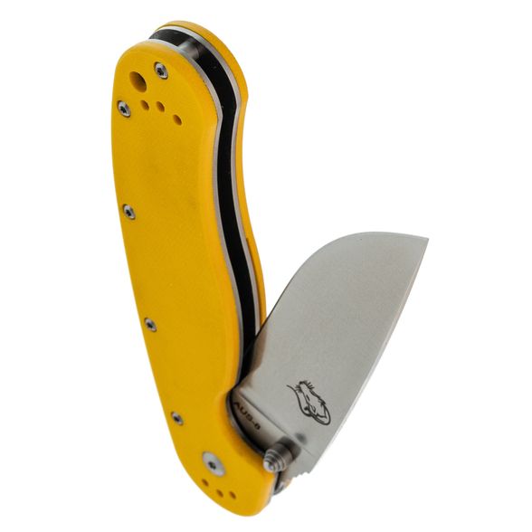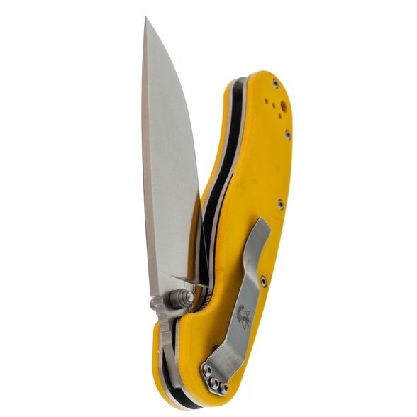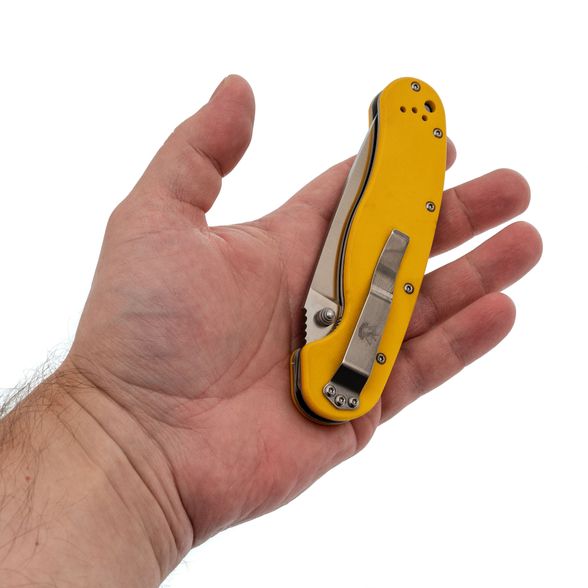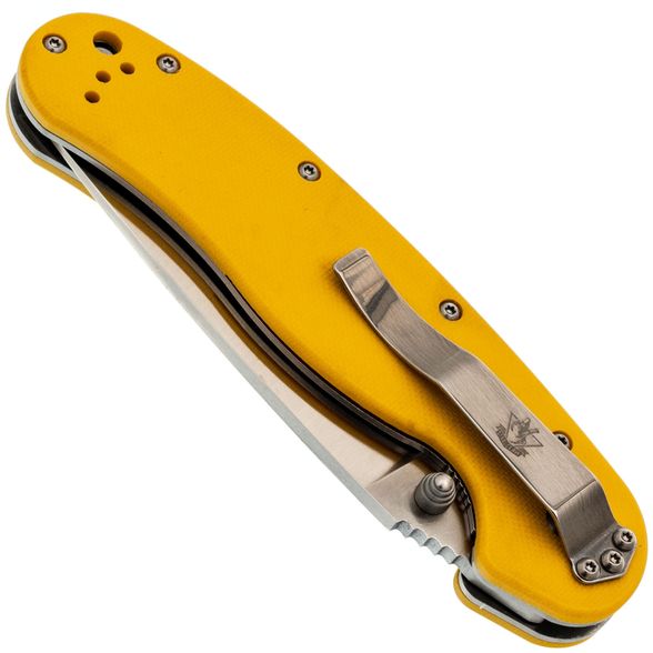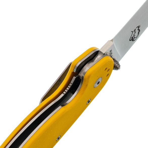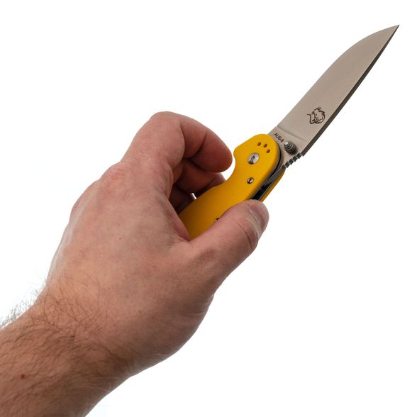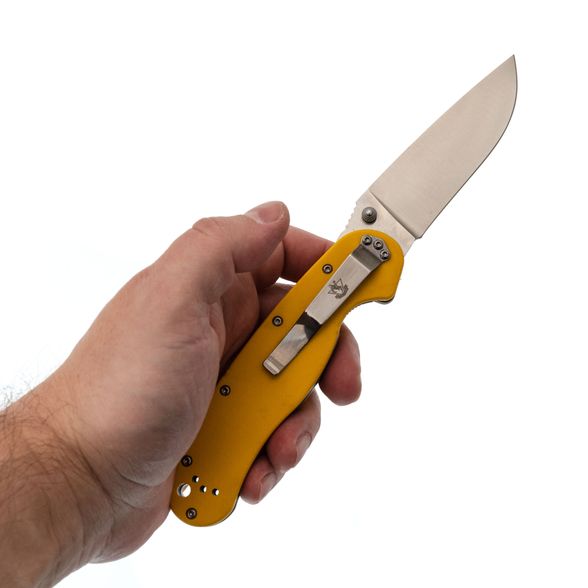 Рукоять ножа выполнена из прочного и легкого стеклотекстолита G10, который не требует особого ухода и отличается долговечностью. Яркий желтый цвет накладок делает нож заметным, что помогает не потерять его в городской среде, однако осенью его лучше не ронять в листву. Эргономичная форма рукояти и оптимальная толщина накладок обеспечивают комфортное удержание и позволяют удобно перехватывать нож близко к клинку для более точных работ. Важной особенностью является клипса, которую можно переставить в четыре разных положения, а также наличие темлячного отверстия для дополнительного удобства при носке.