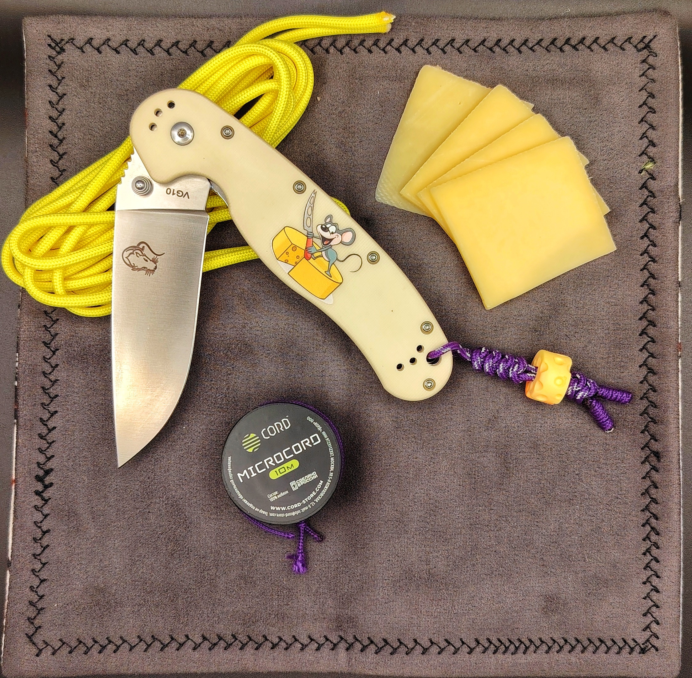 Накладки G10 (белые, принт “крыса и сыр”). Стеклотекстолит не боится перепадов температур и влаги, сохраняет форму, а микрорельеф обеспечивает хват. Графика - аккуратная отсылка к культовой RAT 1.