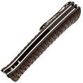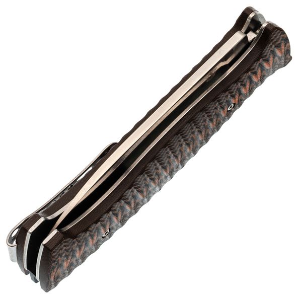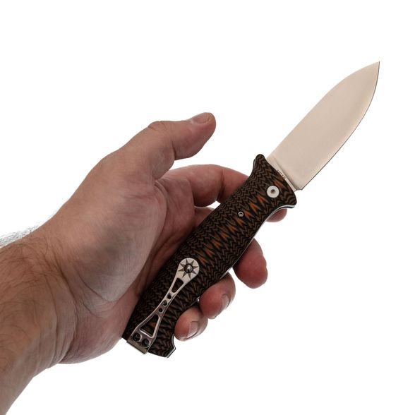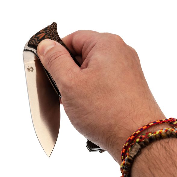 Рукоять с текстурой G10 создаёт удобный захват и комфорт при длительном использовании. Её форма эргономична и подходит для руки любого размера, обеспечивая уверенное удержание инструмента. Текстура не позволяет рукояти выскальзывать из руки, а темлячное отверстие в спейсере добавляет функциональности. К тому же, глубокая клипса позволяет удобно носить нож в кармане.