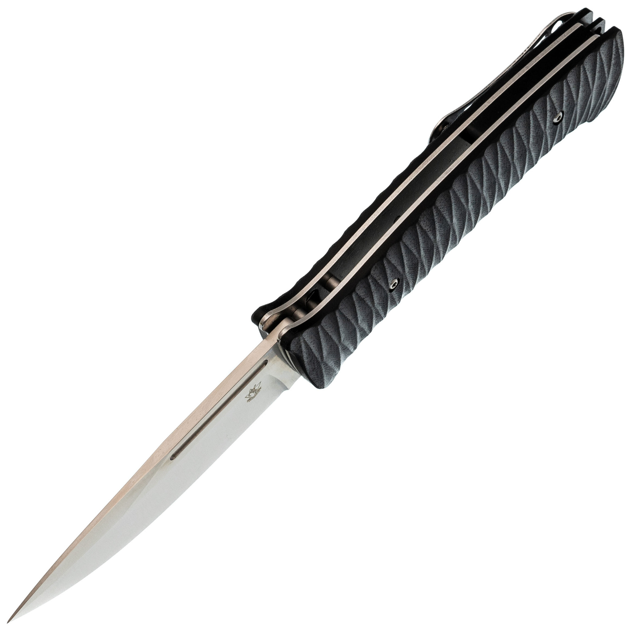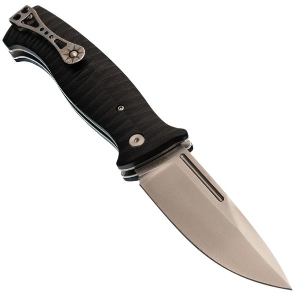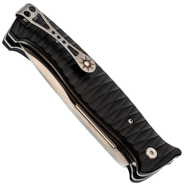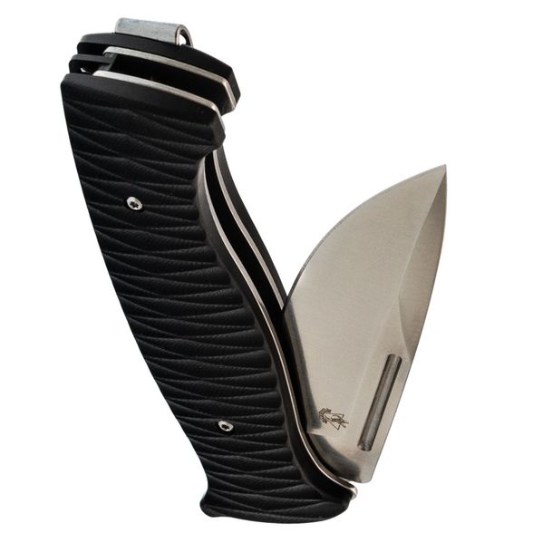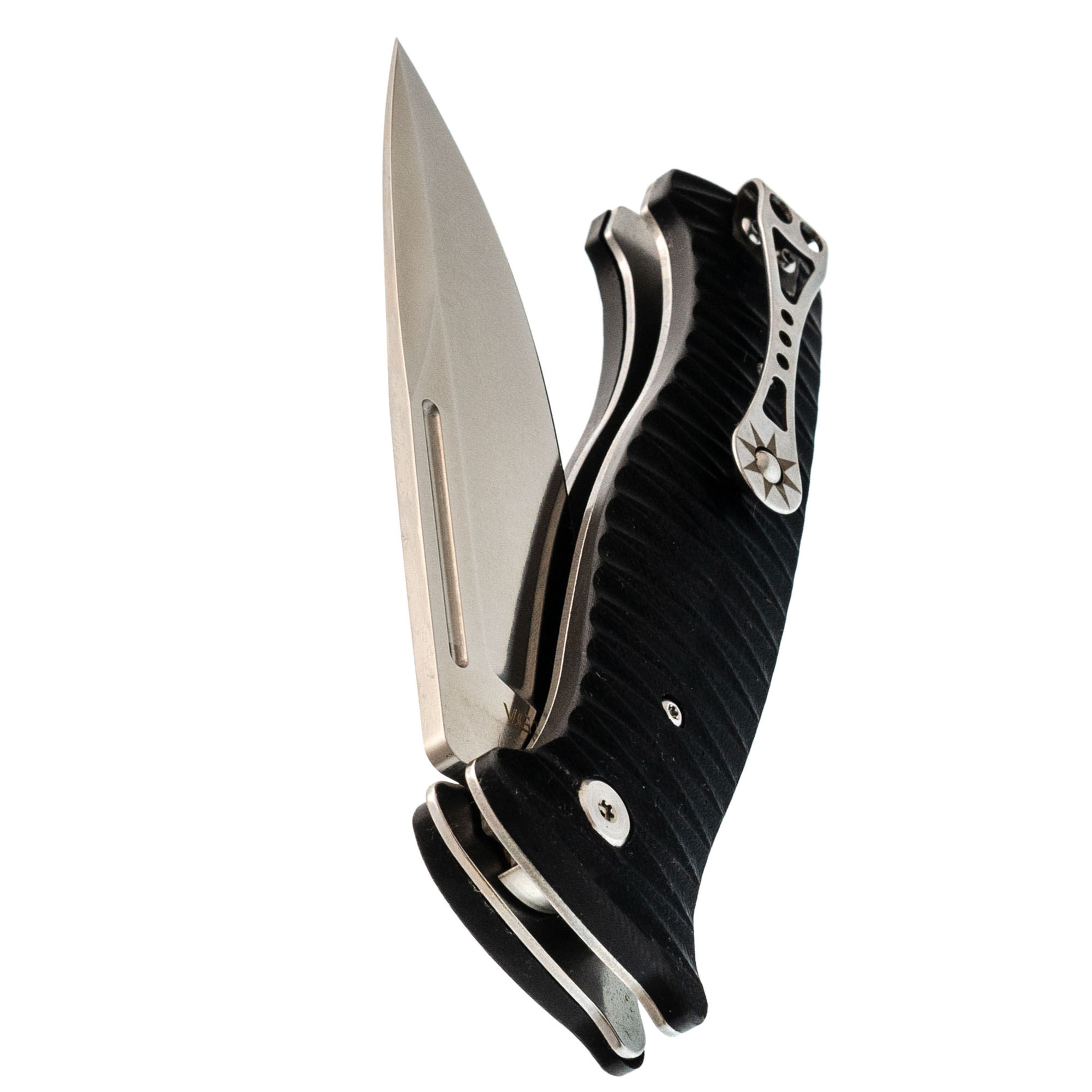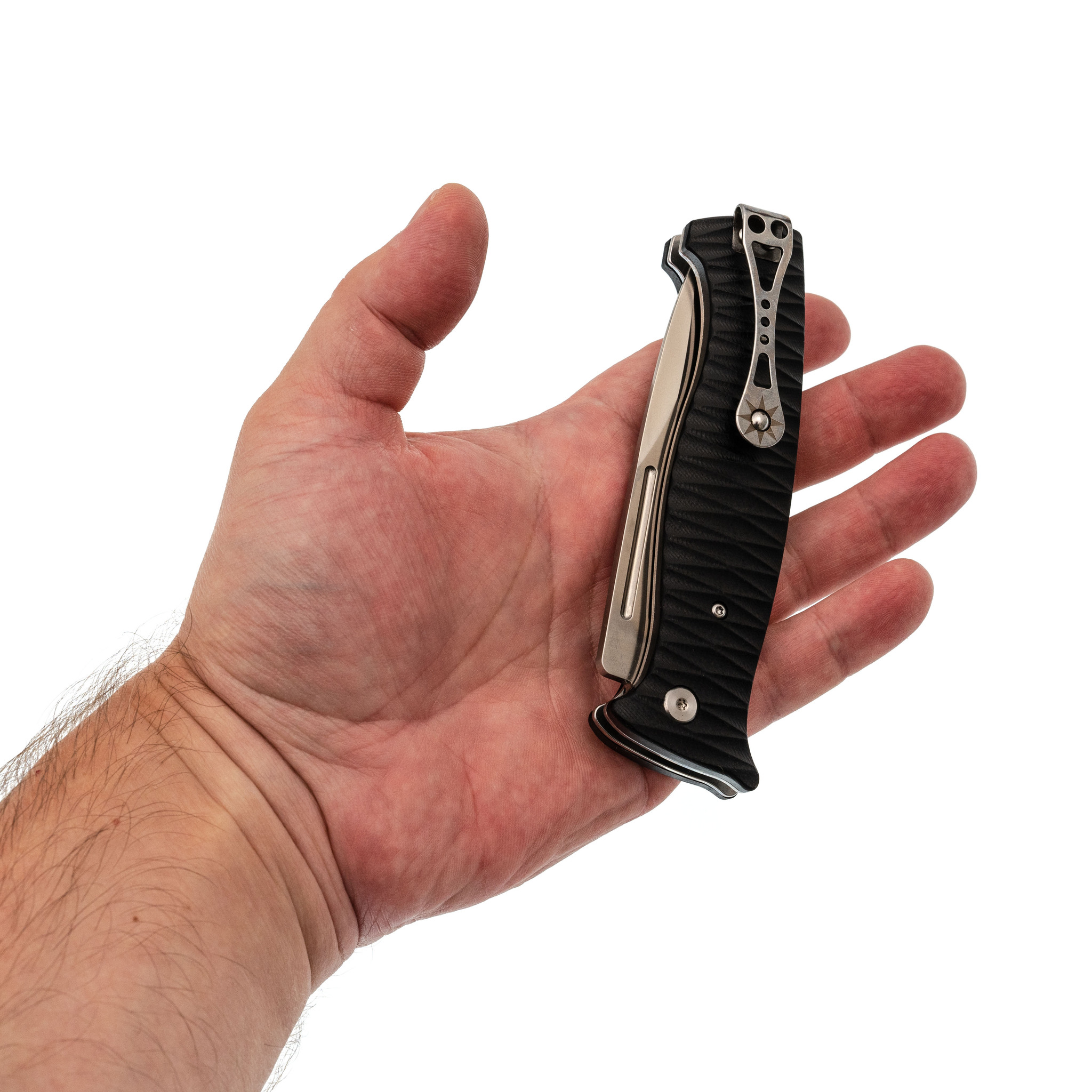 Рукоять ножа выполнена из слоёного G10, обеспечивающего прочность и надежность. Текстурированная поверхность гарантирует удобный захват и комфорт при длительном использовании, а конструкция рукояти заполняет руку, не вызывая дискомфорта. Дополнительное отверстие для темляка и глубокая клипса придают инструменту еще больше функциональности, позволяя носить его с удобством.