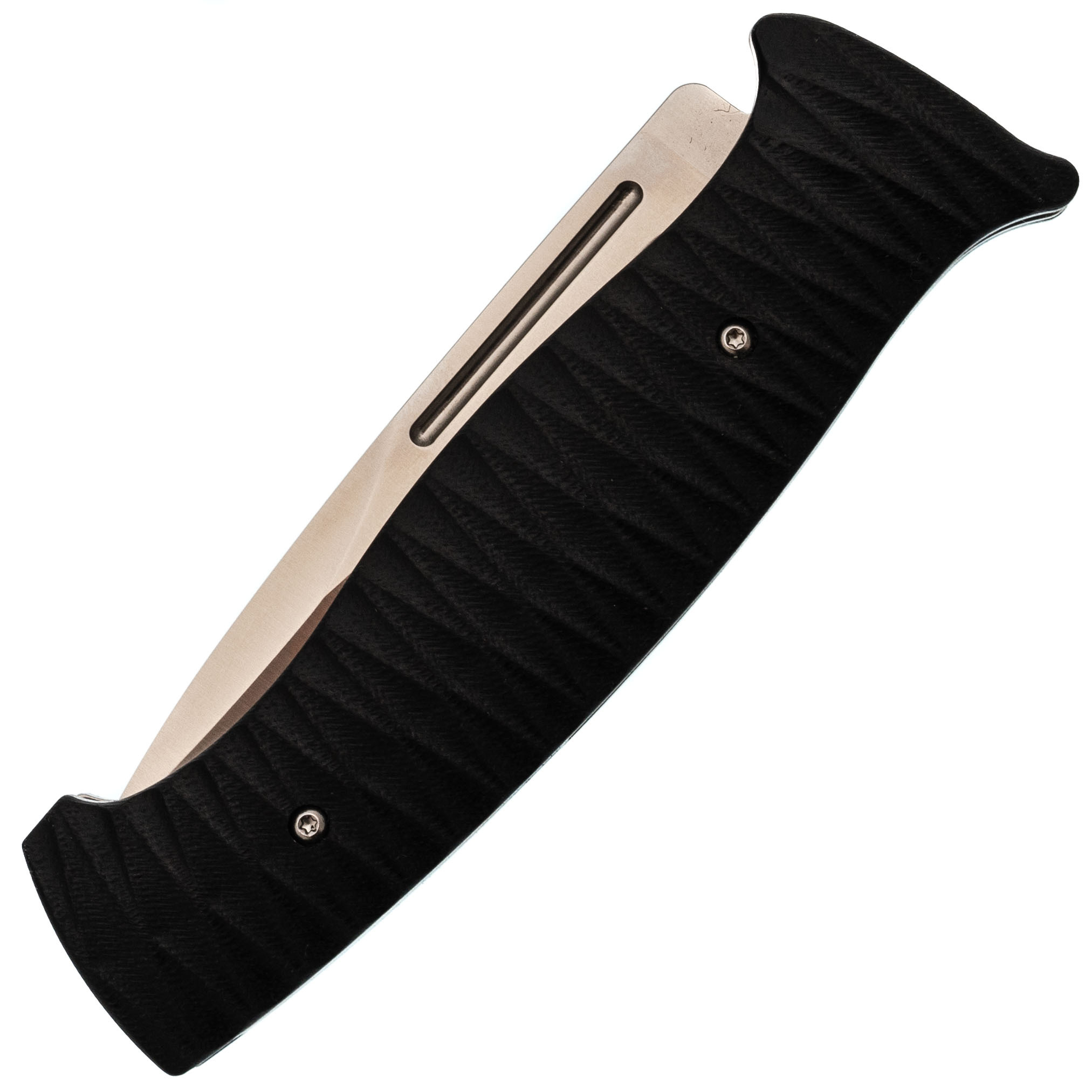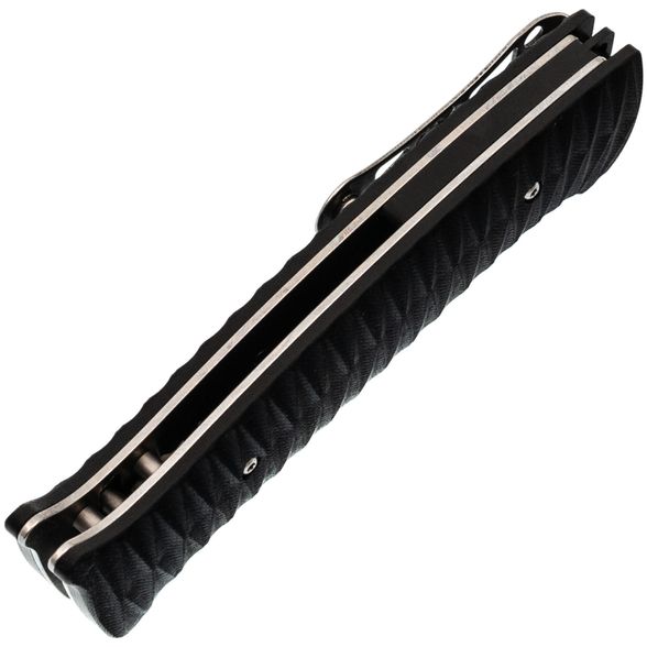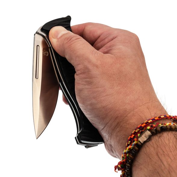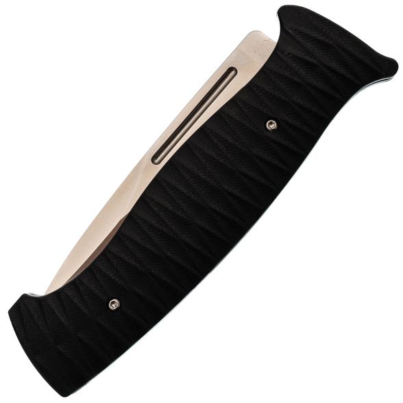 G10 (черно-синий слоёный) - прочный и лёгкий материал, который придаёт рукояти отличную устойчивость к механическим повреждениям и износу. В сочетании с глубоким текстурированием он предотвращает скольжение, что повышает безопасность при использовании.