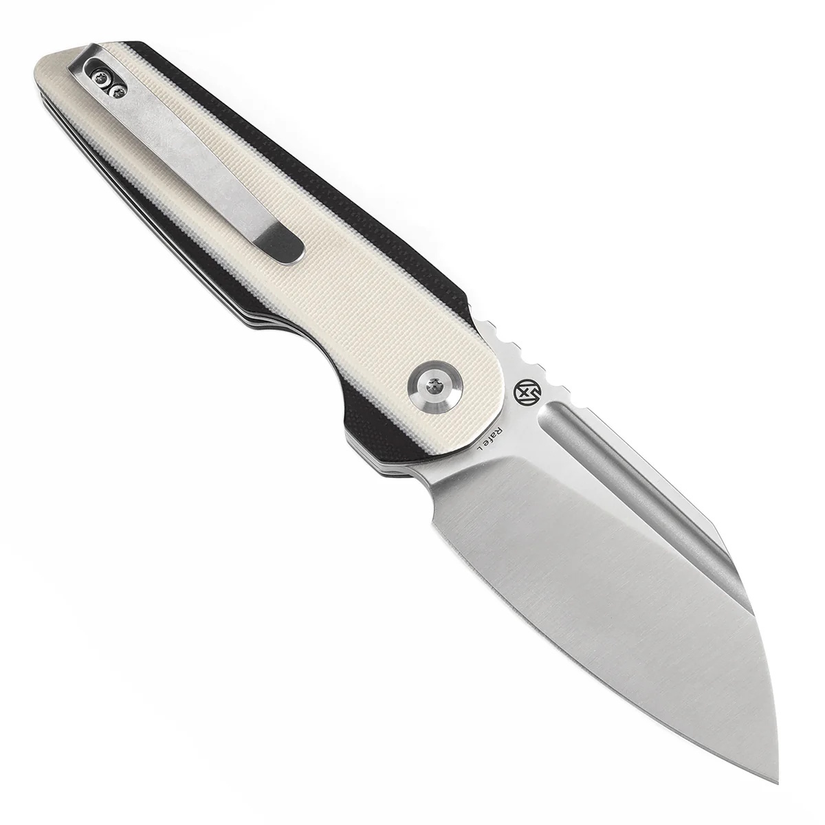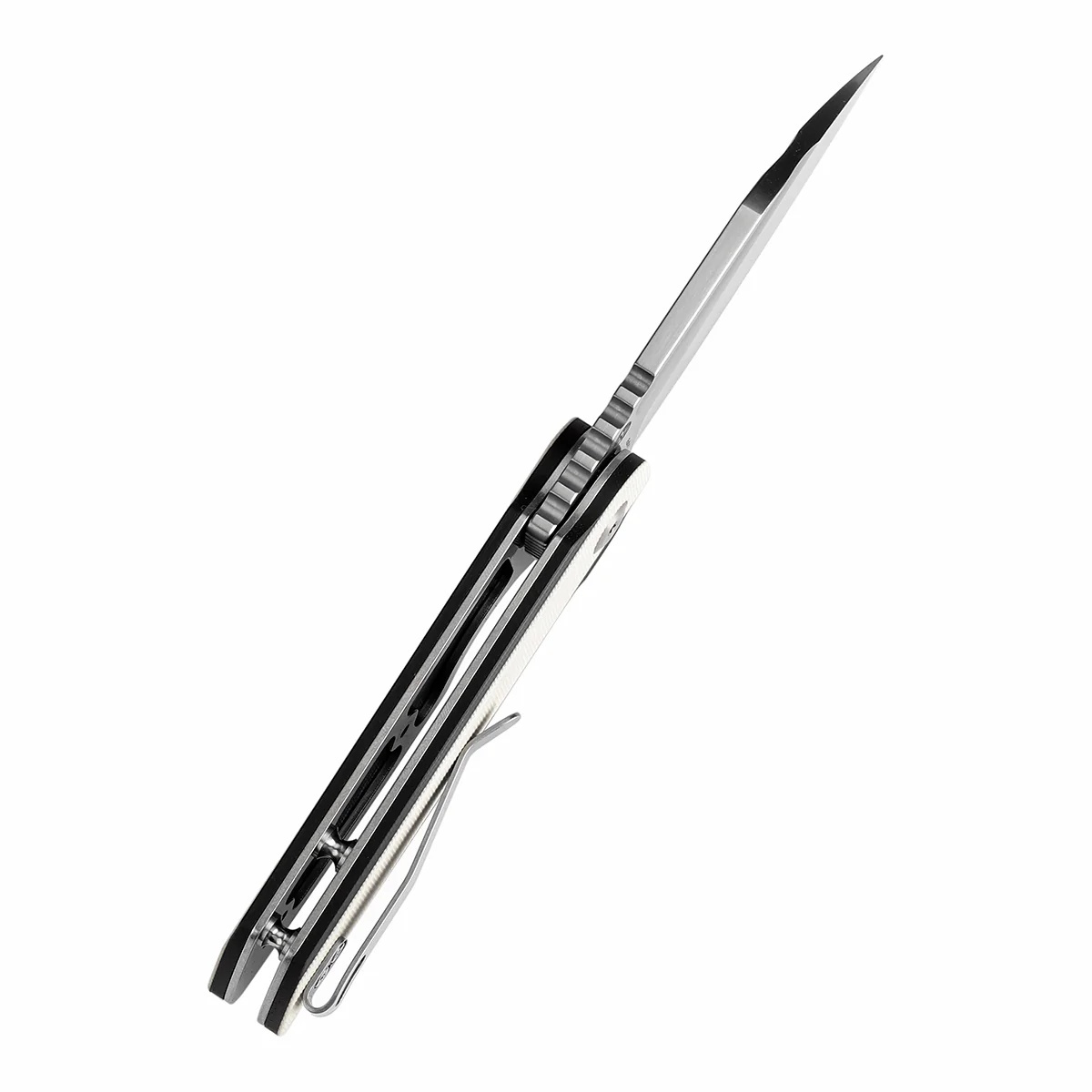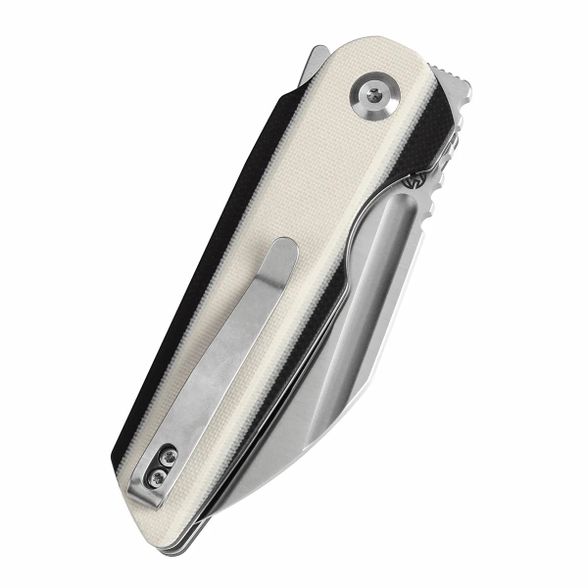 Рукоять из G10 выполнена в чёрно-белом цвете и отличается цепкой текстурой, обеспечивающей уверенное удержание даже во влажных условиях. Эргономичная форма адаптирована под естественное положение кисти, что делает использование комфортным в течение длительного времени. Материал не скользит, легко очищается и устойчив к внешним воздействиям. Сбалансированная геометрия конструкции позволяет уверенно контролировать инструмент в любых бытовых сценариях.