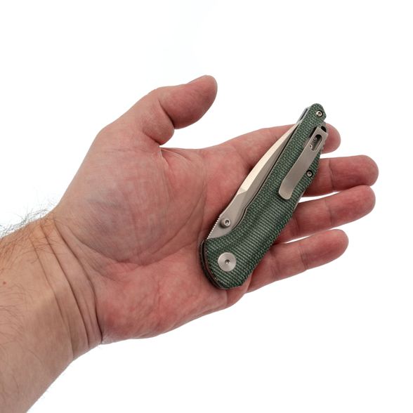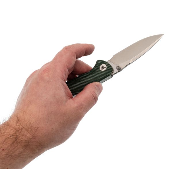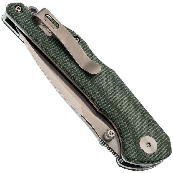 Рукоять Trivisa Arae выполнена из микарты — прочного и лёгкого материала, который не боится воздействия воды и не скользит в руке благодаря своей бархатистой текстуре. Рукоять хорошо заполняет руку, обеспечивая уверенное и комфортное удержание, что важно при длительном использовании инструмента. Модель также оснащена переставляемой клипсой, что делает её удобной для использования как правшами, так и левшами. Наличие темлячного отверстия добавляет дополнительную функциональность и удобство в повседневном ношении ножа.