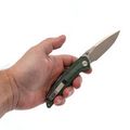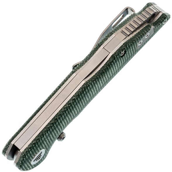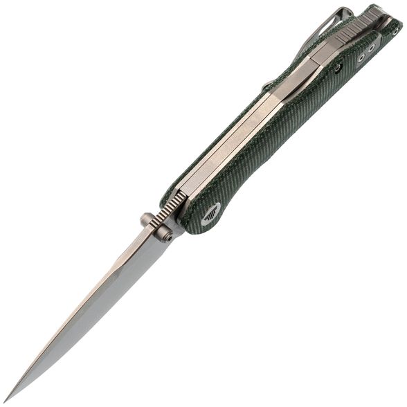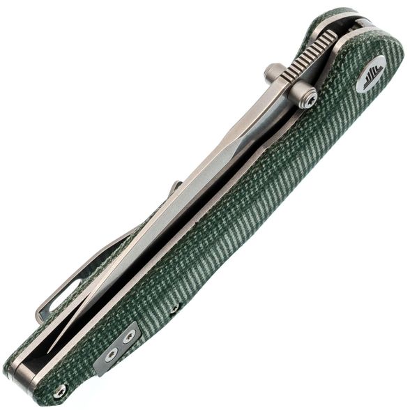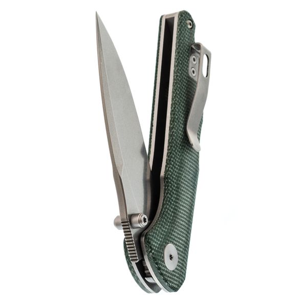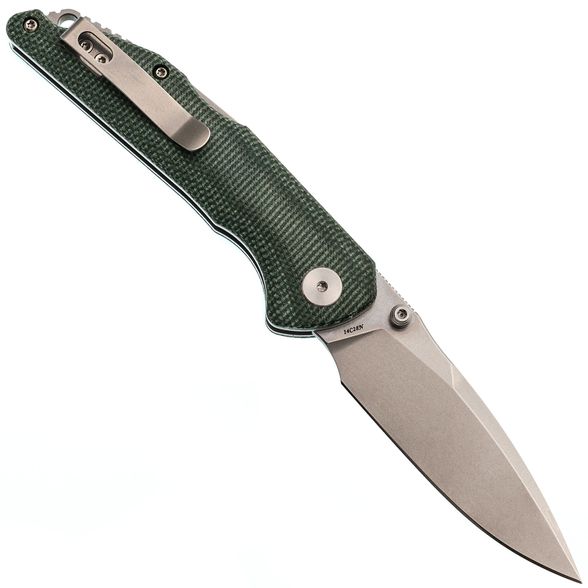 Клинок Trivisa Arae выполнен из стали 14C28N, которая славится своей прочностью и хорошей устойчивости к образованию ржавчины. Эта сталь обеспечивает долгое удержание остроты, а так де легко затачивается на тонкие углы. На клинке имеется покрытие Black Stonewash, которое не только повышает его коррозионную стойкость, но и скрывает возможные царапины и следы использования. Геометрия клинка с профилем Drop-Point и прямыми спусками делает его идеальным для резки и строгания. Открывается нож с помощью двухсторонних шпеньков, что позволяет использовать его как правше, так и левше.