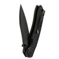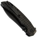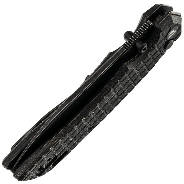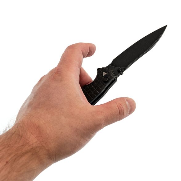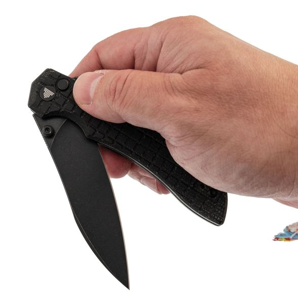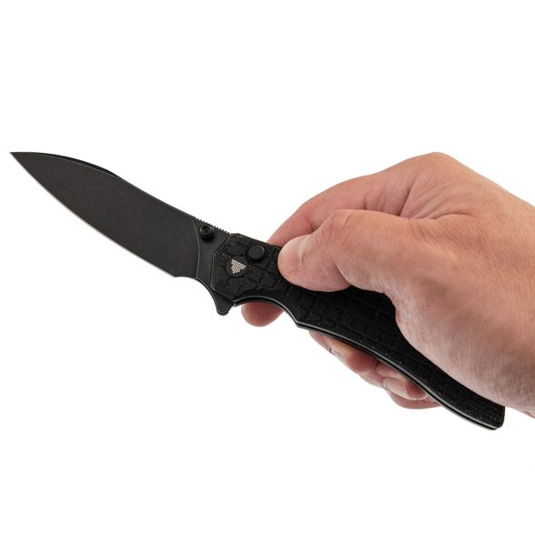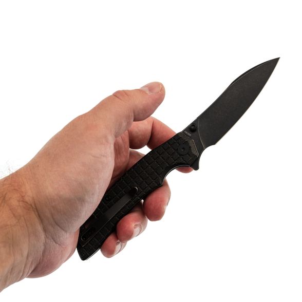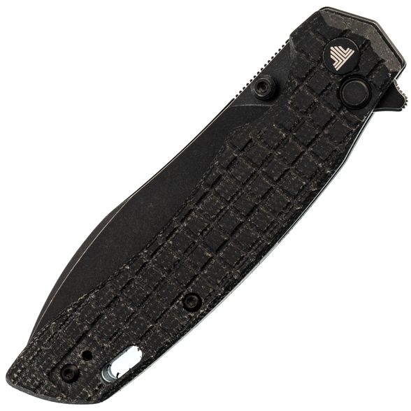 Рукоять имеет изогнутую форму, которая предельно естественно ложится в руку, а подпальцевая выемка вместе с флиппером формируют надёжный упор, за счет чего вы можете быть уверены, что рука не соскользнёт на режущую кромку. Накладки рукояти выполнены из микарты - прочного полимерного материала, который не боится ни воды, ни перепадов, ни ударных нагрузок. Одна из особенностей ножа это Frag Pattern на рукояти, такая текстура обеспечивает хорошую цепкость и приятную шершавость рукояти.