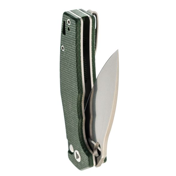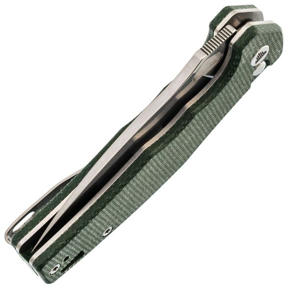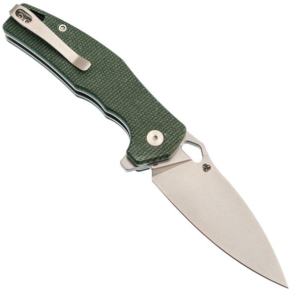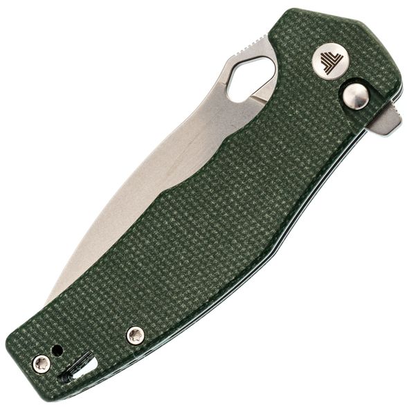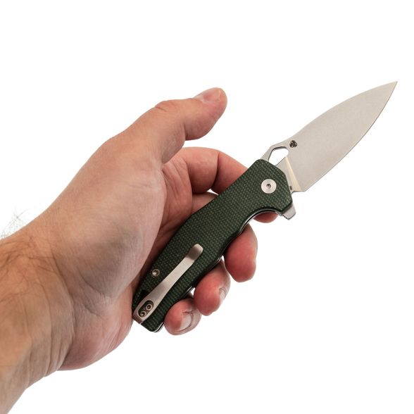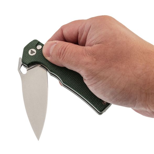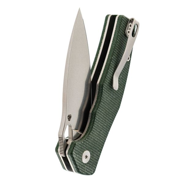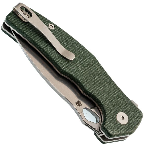 Рукоять Trivisa Corvus имеет изогнутую форму, благодаря чему она идеально ложится в руку. Подпальцевые выемки позволяют надежно удерживать нож, обеспечивая максимальный контроль во время использования. Плавник на рукояти формирует хороший упор, предотвращая соскальзывание руки на режущую кромку. Накладки из микарты - прочный и стабильный полимерный материал, который не боится воды, перепадов температур и грязи, что делает его отличным выбором для рукояток ножей. В рукояти имеется темлячное отверстие и клипса глубокой посадки, которая может быть переставлена для удобства ношения в различных положениях.