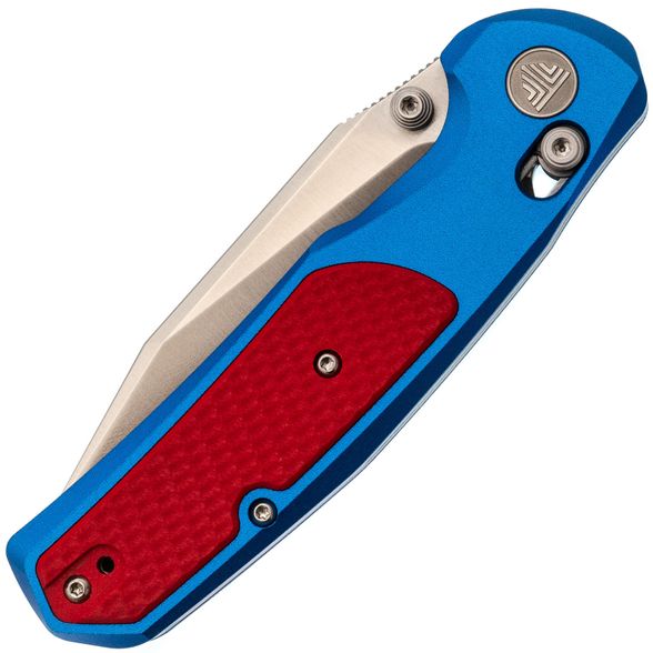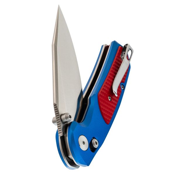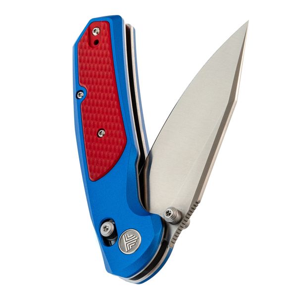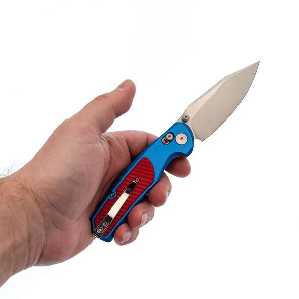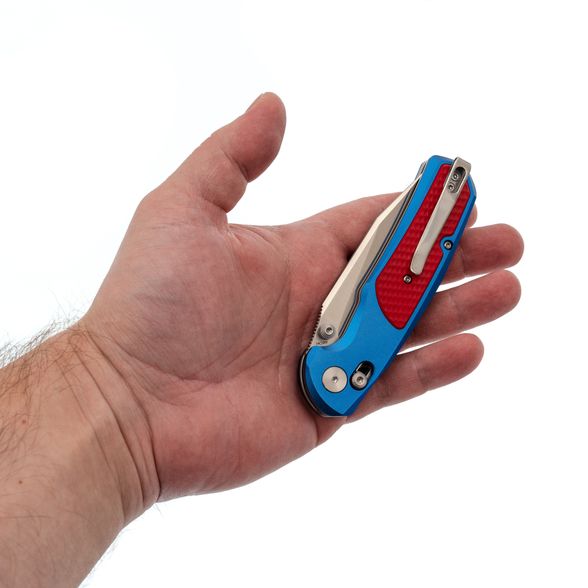 Рукоять выполнена из анодированного алюминия синего цвета с яркой вставкой из красного G10. Такой выбор материалов не только создает интересный визуальный контраст, но и улучшает сцепление с рукой, обеспечивая удобство при использовании ножа. Алюминий при этом очень лёгкий и прочный, а вставка из G10 добавляет рукояти дополнительную цепкость. Эргономичная форма с подпальцевой выемкой делает удержание ножа удобным и безопасным, а замок Axis-Lock гарантирует быструю и надёжную работу. Замок, который работает одинаково хорошо как для правшей, так и для левшей, позволяет открывать и закрывать нож инерционно. Клипса глубокой посадки и возможность её перестановки делают этот нож удобным для использования людьми любой руки.