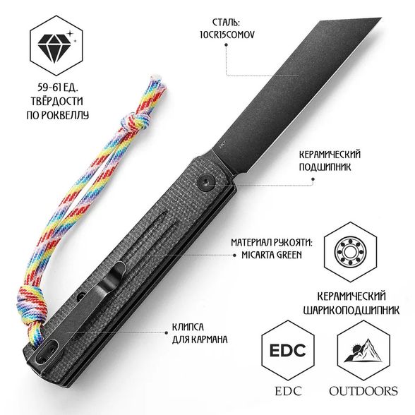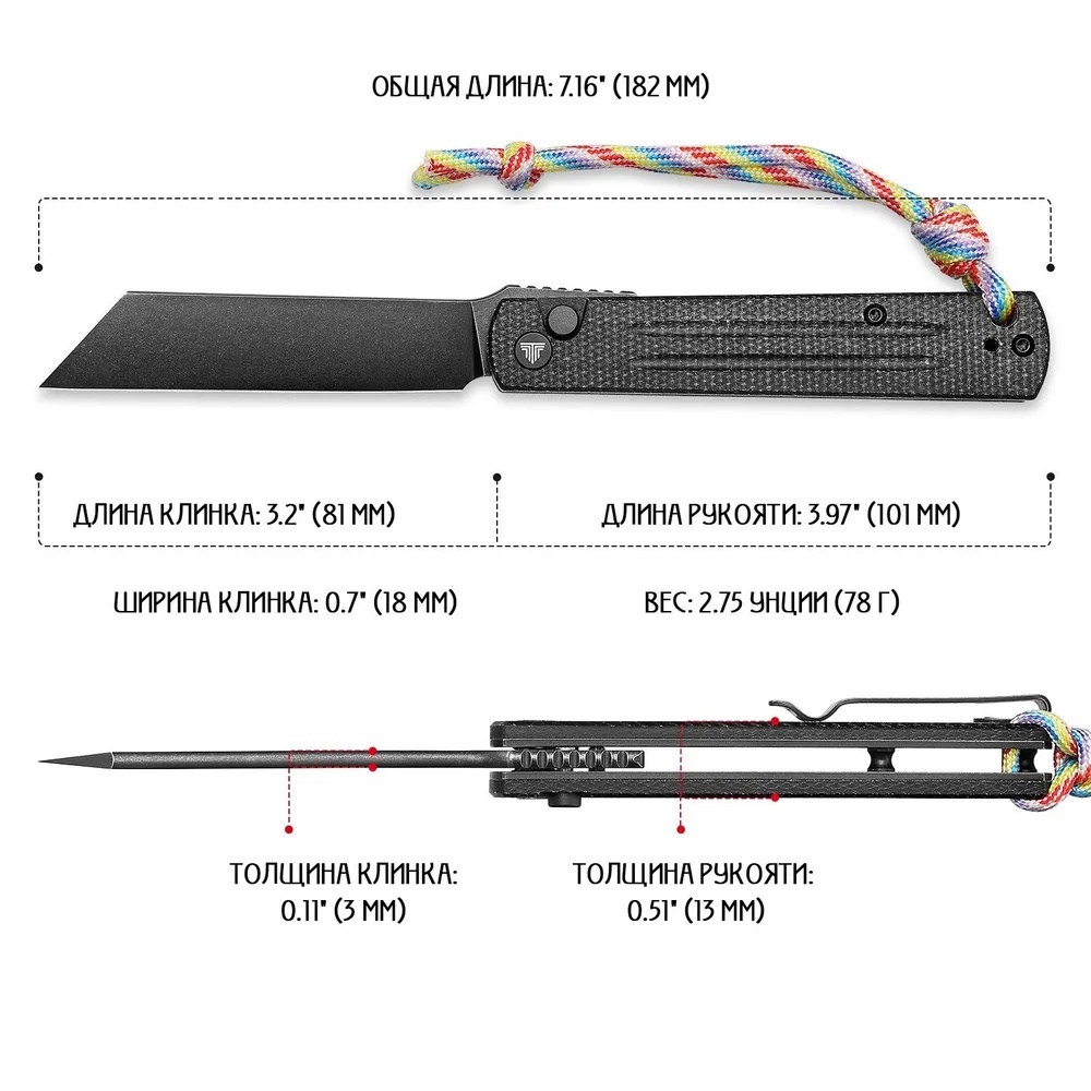 Рабочая часть выполнена из стали 10Cr15CoMoV с черным покрытием, устойчивым к внешним воздействиям и истиранию. Толщина обуха 3 мм придает конструкции необходимую жесткость, позволяя уверенно справляться с плотными материалами. Износостойкое острие сохраняет рабочие свойства даже при интенсивной эксплуатации. Обработка поверхности снижает отражение света и подчеркивает строгий характер модели, ориентированной на стабильную работу в повседневных условиях.